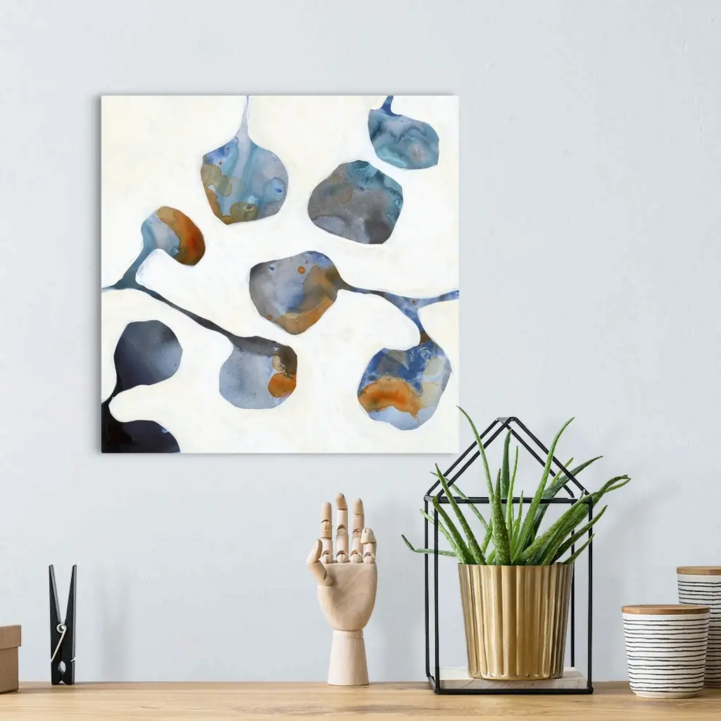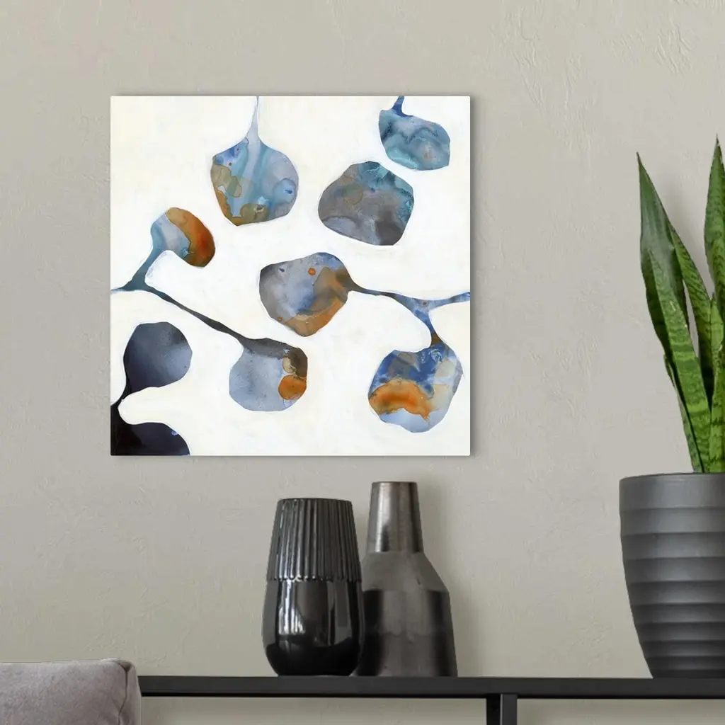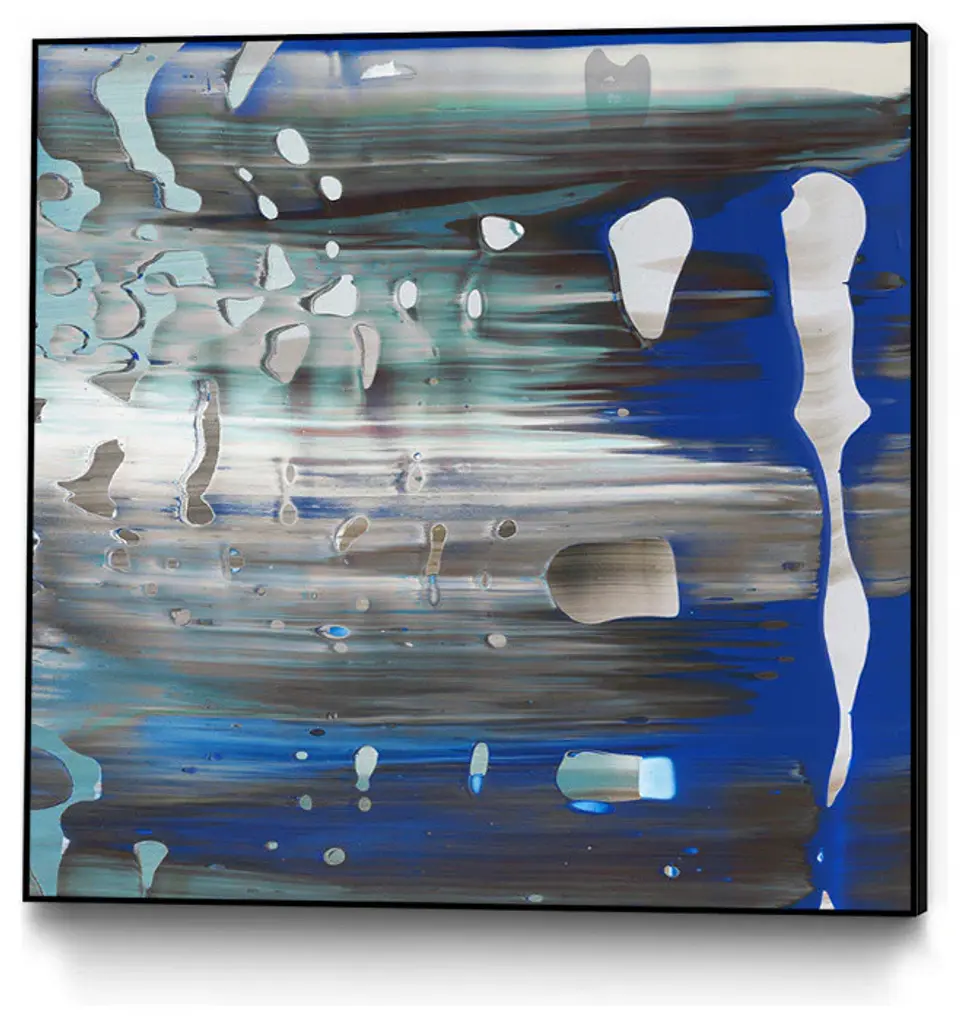 This painting was created by rendering a blue watery background in acrylic and allowing it to dry without any brushstrokes. Once it was dry I painted the white background which is actually the foreground and was painted last. The negative space by painting the white created the floral shapes. I finished it by using a gel medium which not only protects the surface it brings out the color adding dimension and texture.