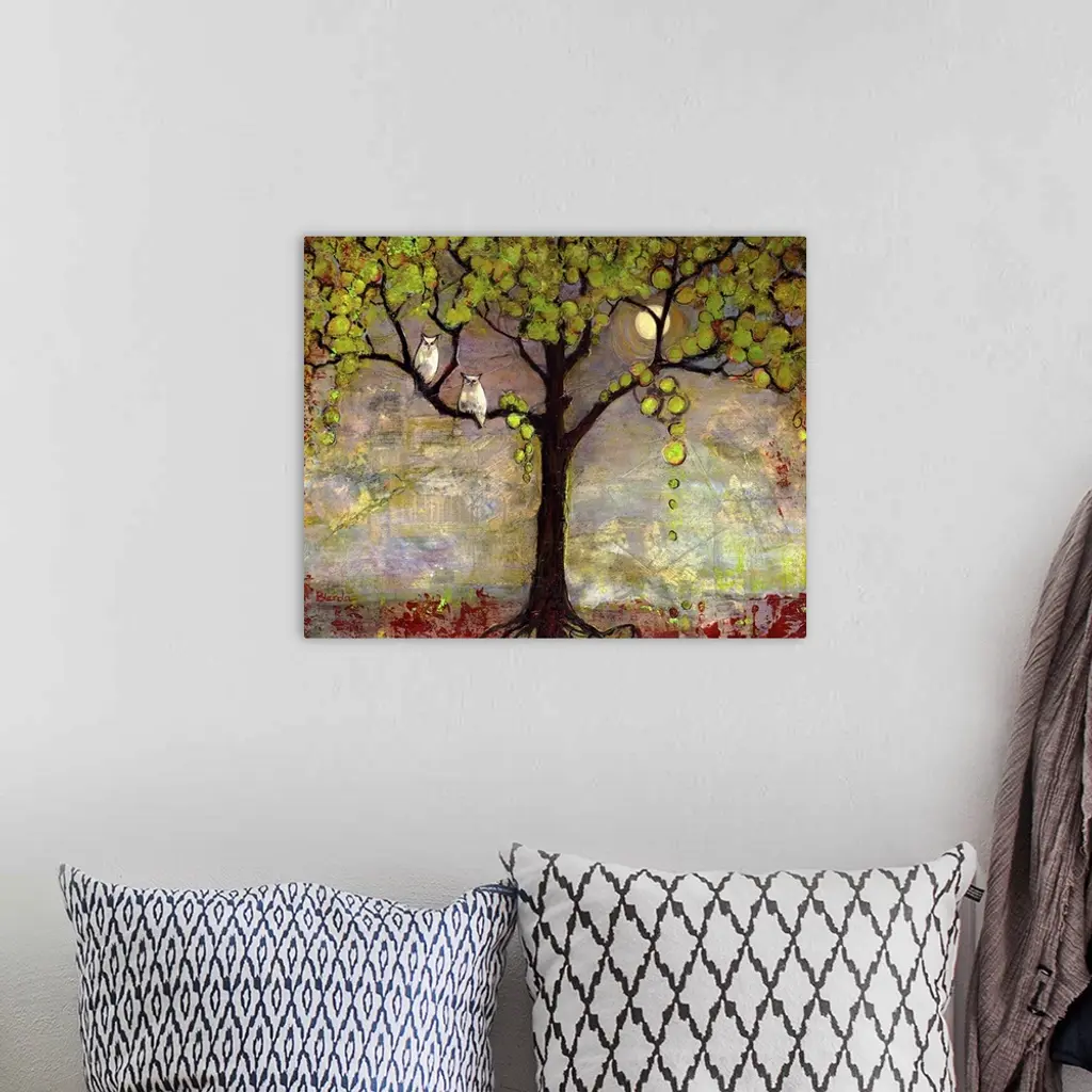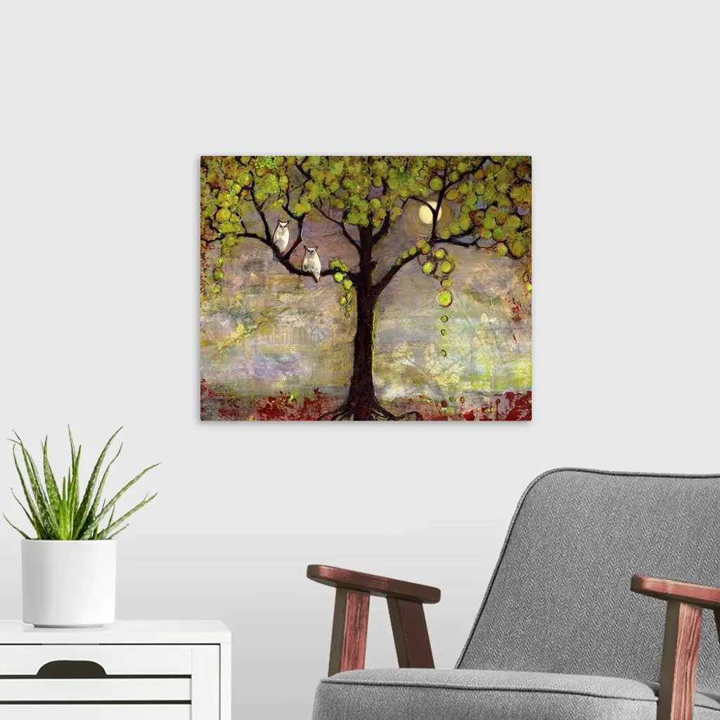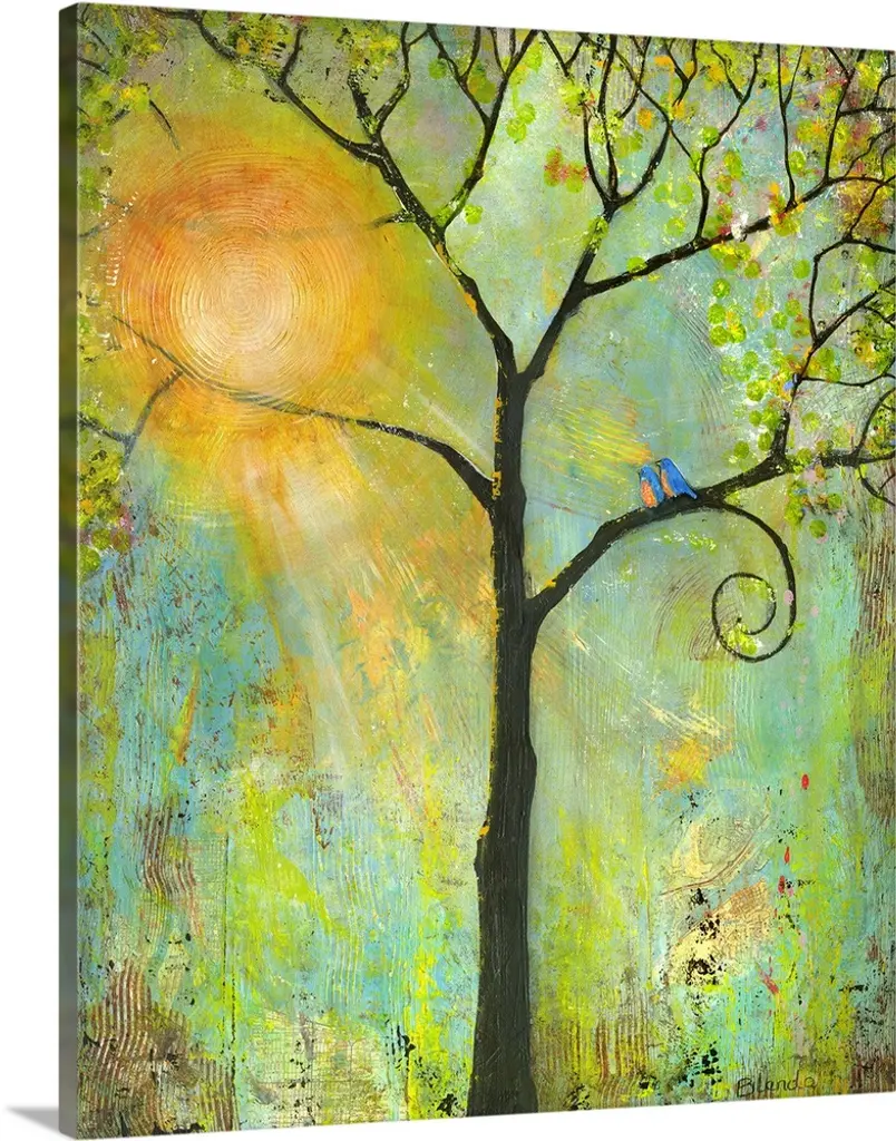 Lighthearted contemporary painting of a tree with birds perched on the on the branches.