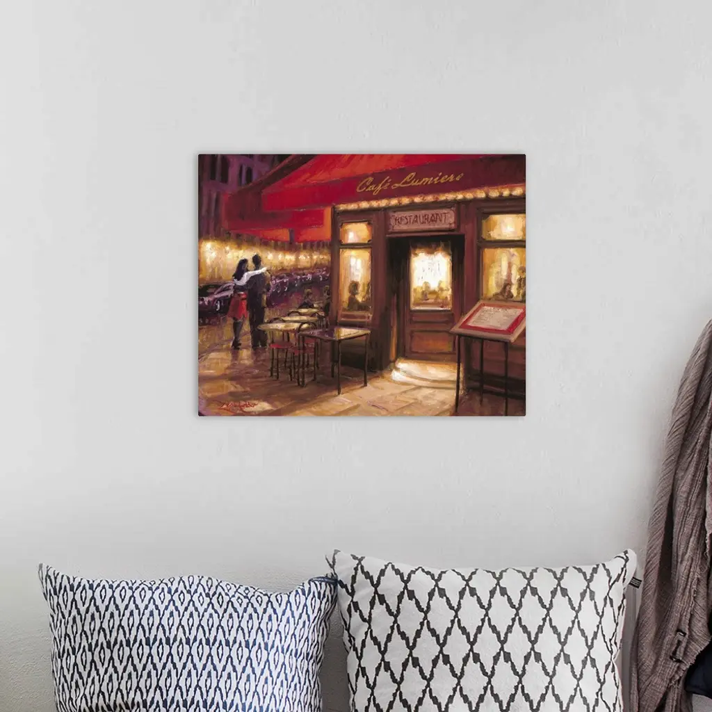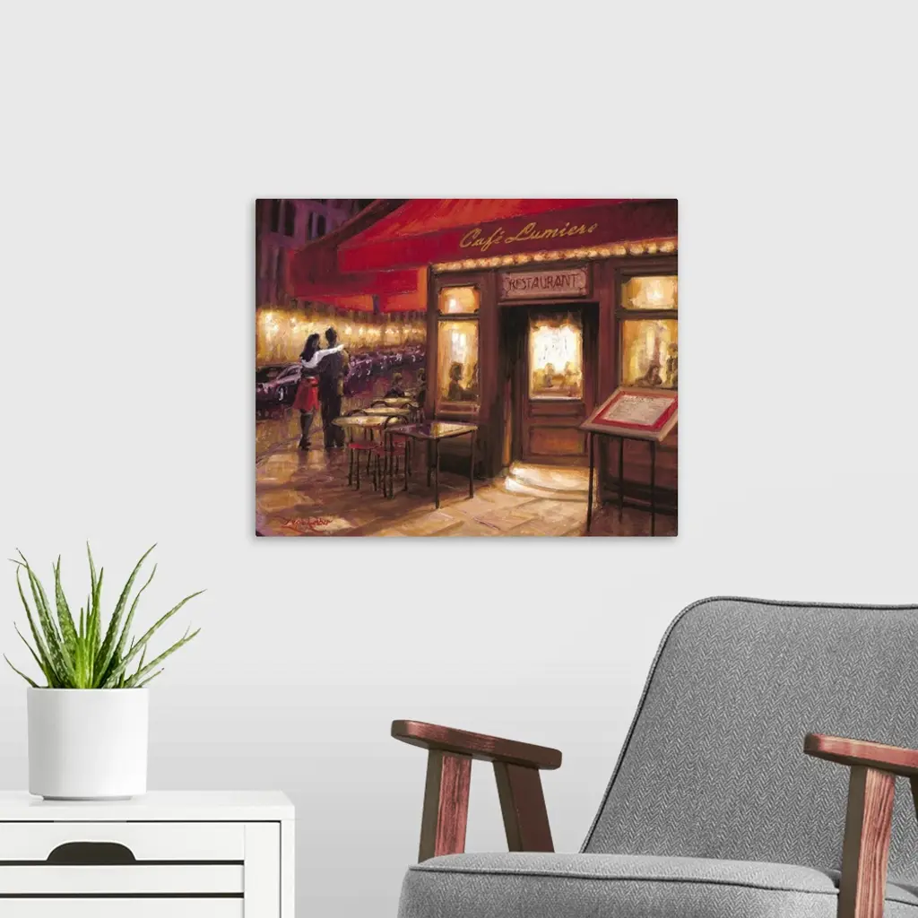 Contemporary painting of a couple in a loving embrace walking by a cafe at night.