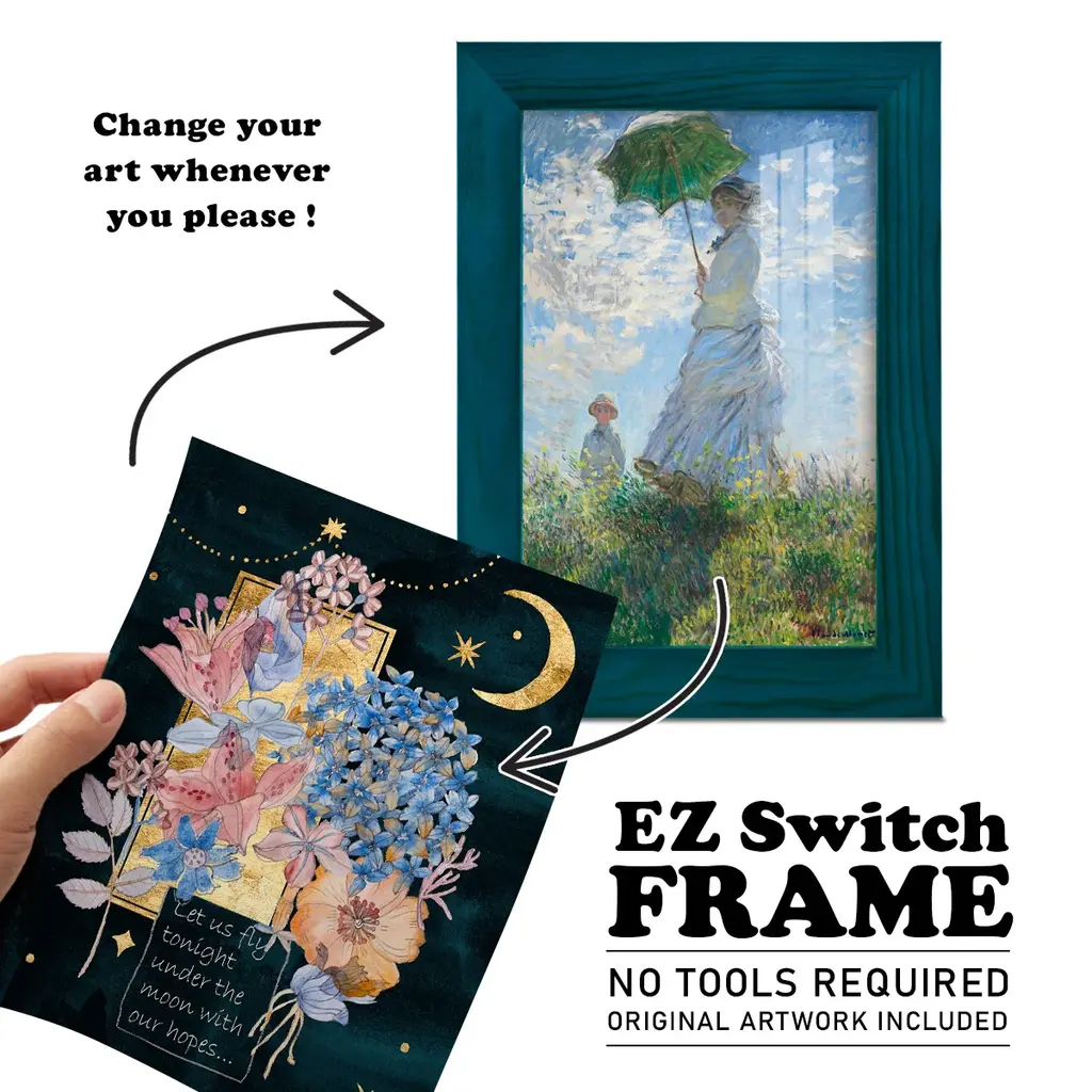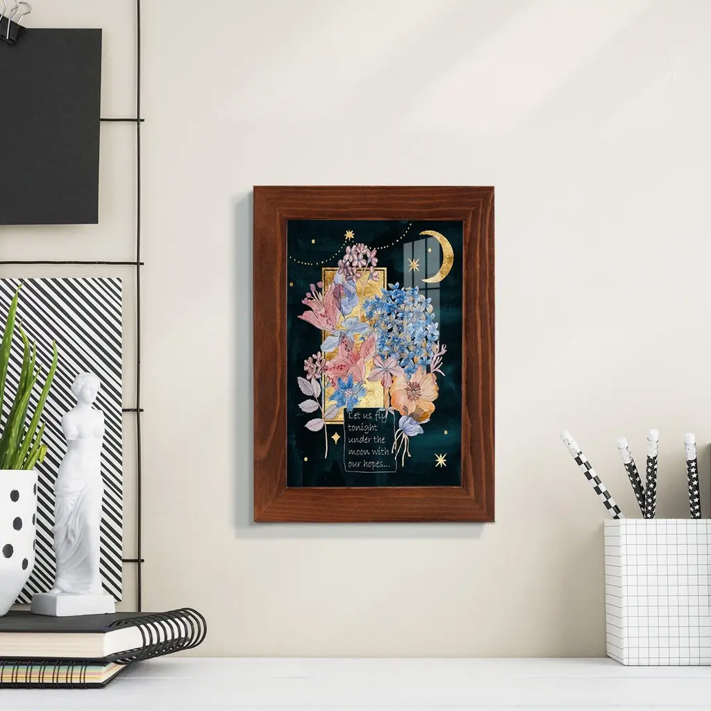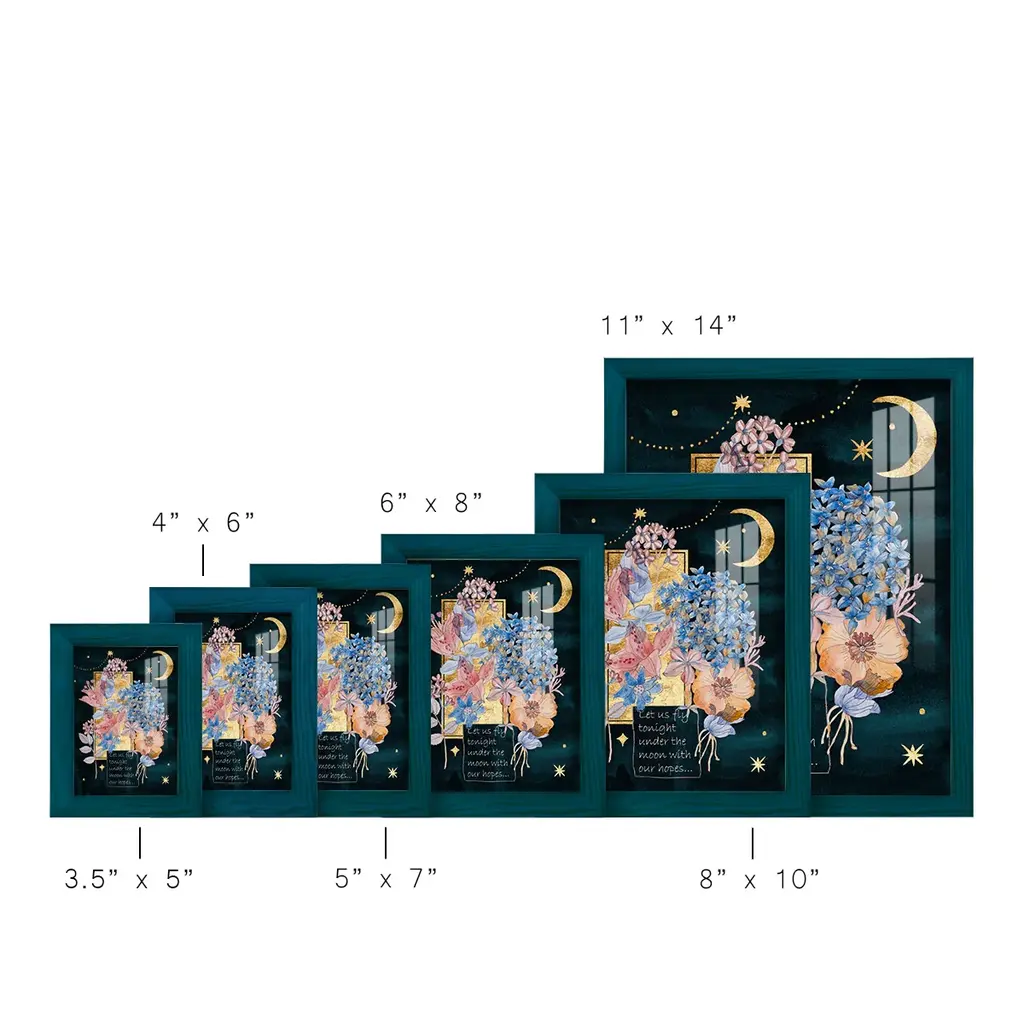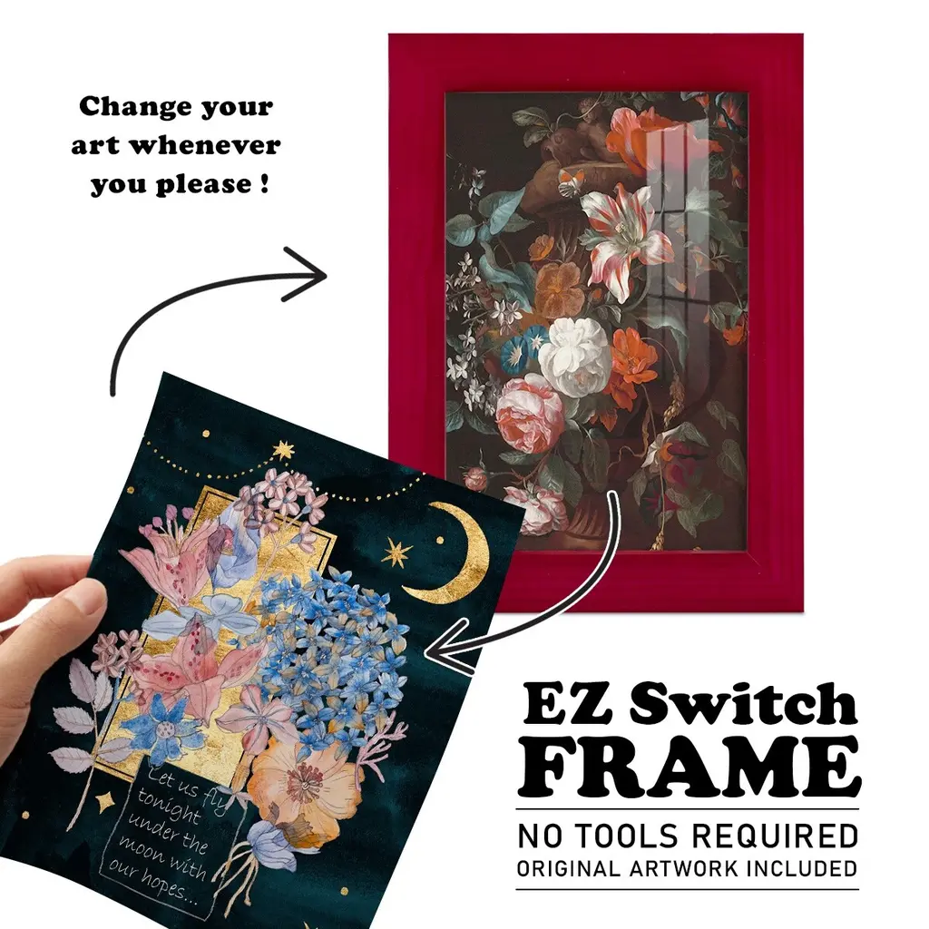Moonlight Flowers I -EZ SWITCH Framed Print w/glass-Cherry Red A delightful, framed print. Featuring a solid wood frame with real wood glass. This premium print is giclee quality. In addition, every frame features a removable back and table top stand. This allows you to change your art in the future or to just stand the art on a table for a new look. We are sure you'll enjoy our new series of EZ SWITCH Framed Art. Solid Wood Frame Real Glass Removable / Replaceable Art Built in Tabletop Stand Sizes range from 4x6 up to 12x15 - buy just one or pair them up as sets as you see fit.