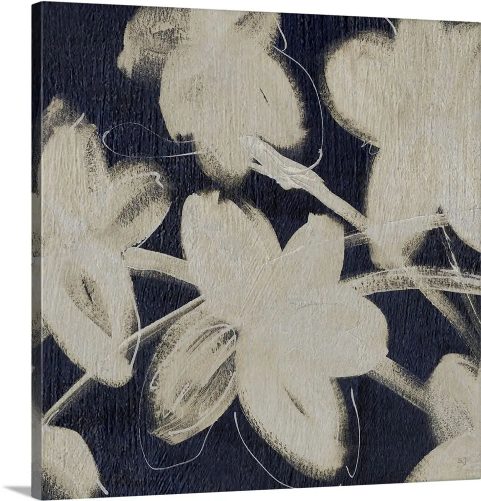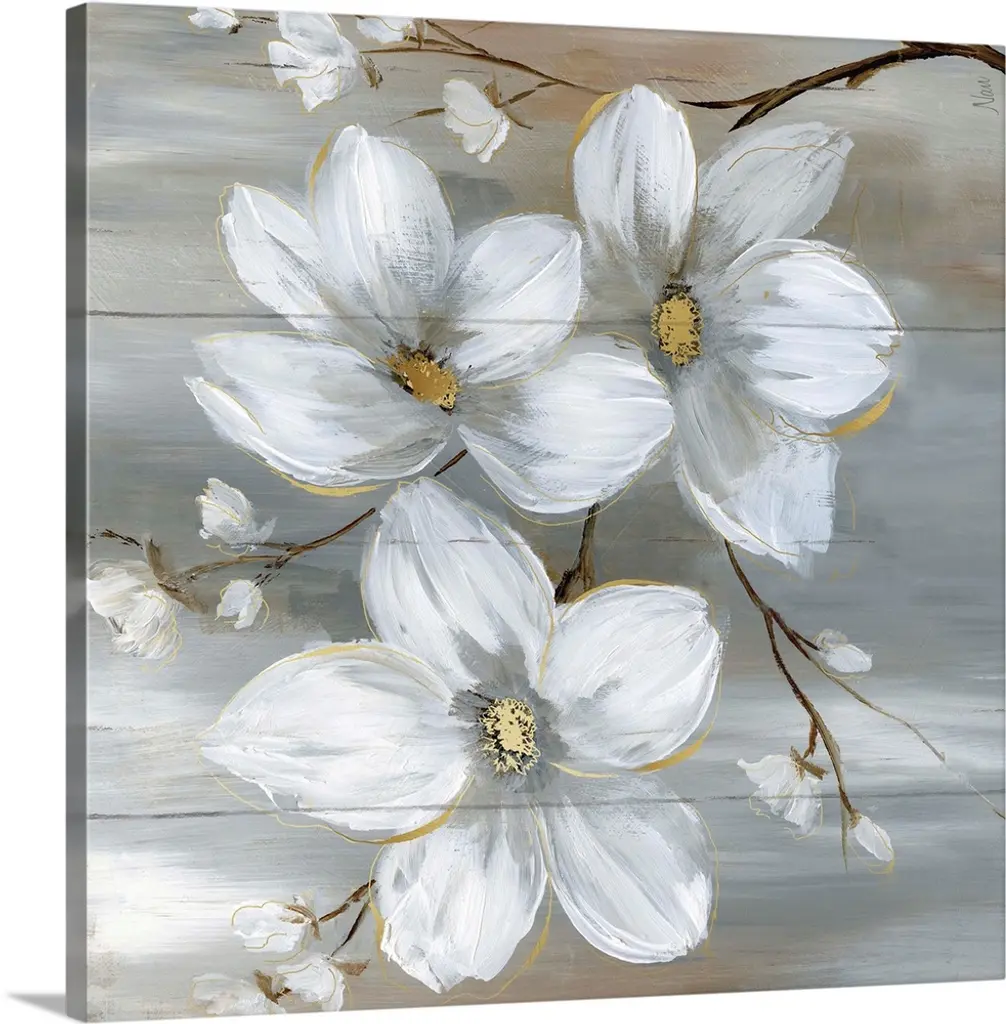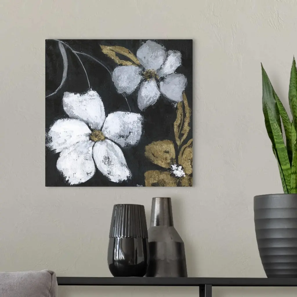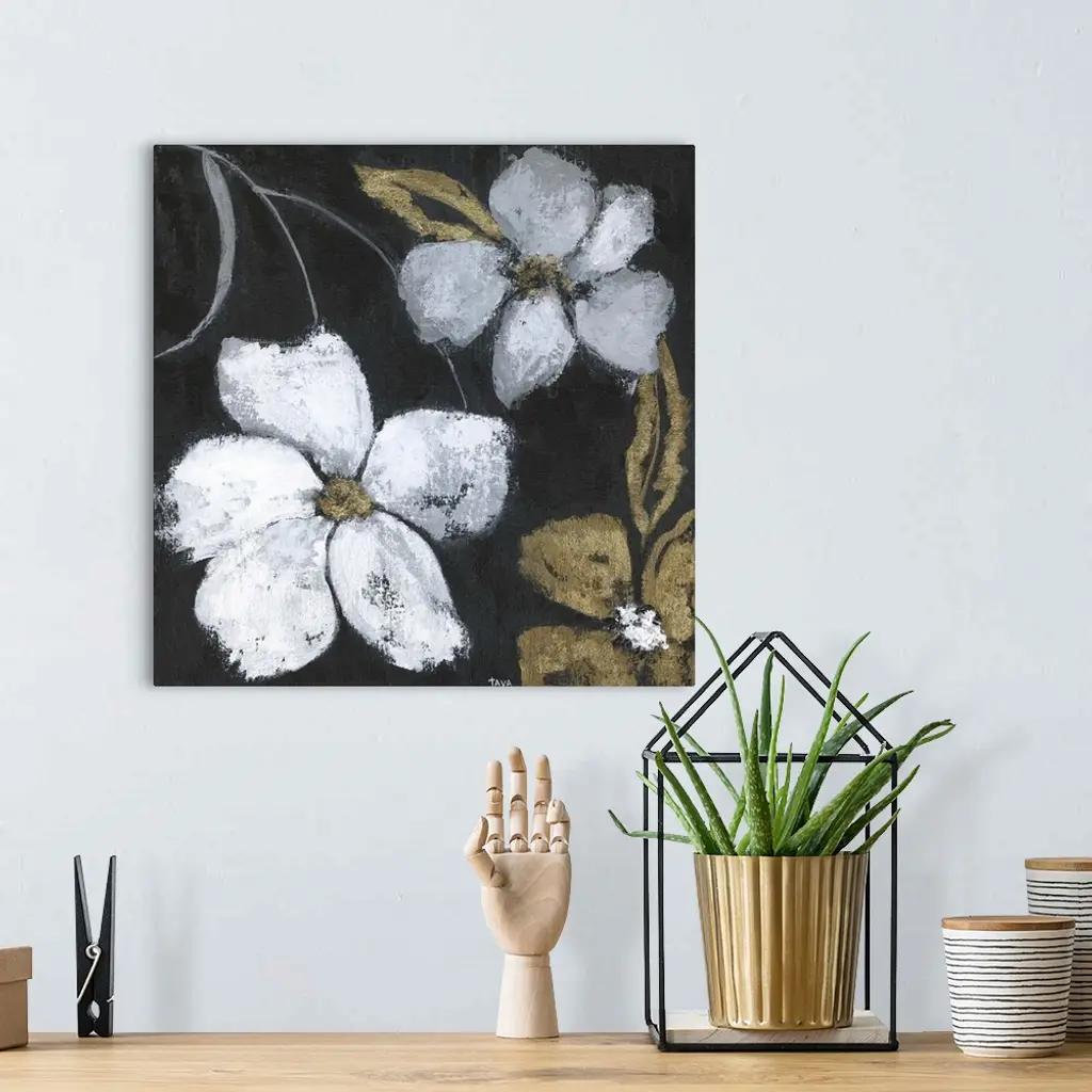 Flowers of a gold metallic color and white stand out against a black backdrop in this painting.