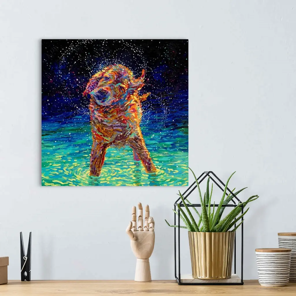 Brightly colored contemporary artwork of a dog shaking off water in the moonlight.