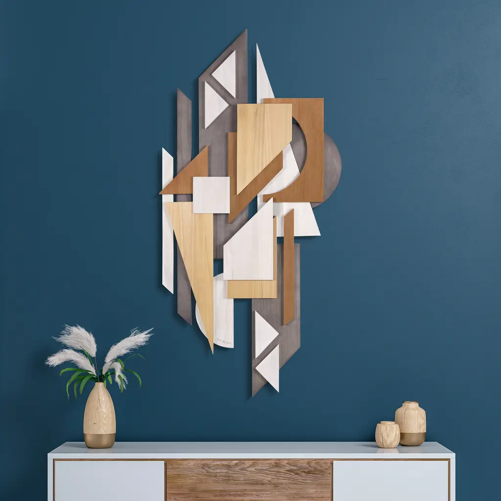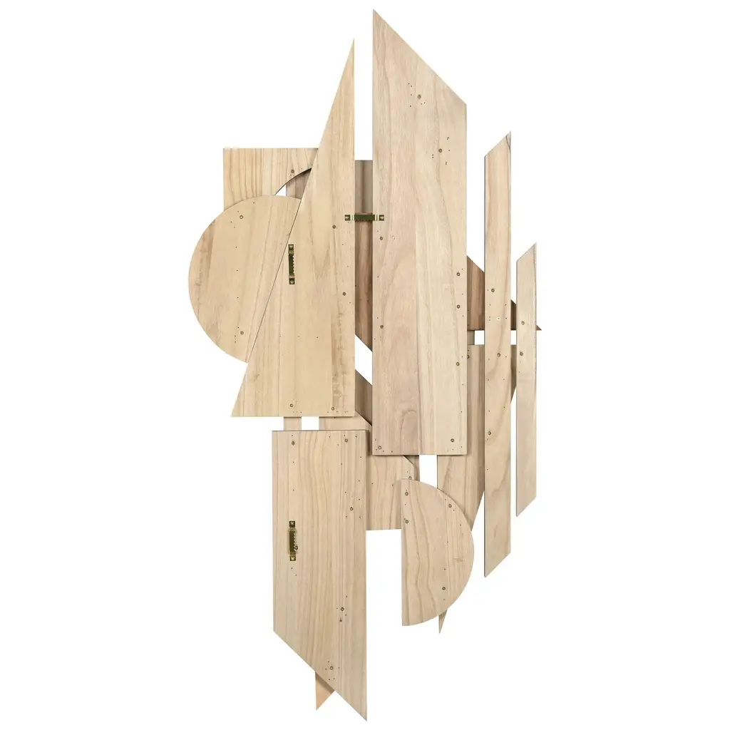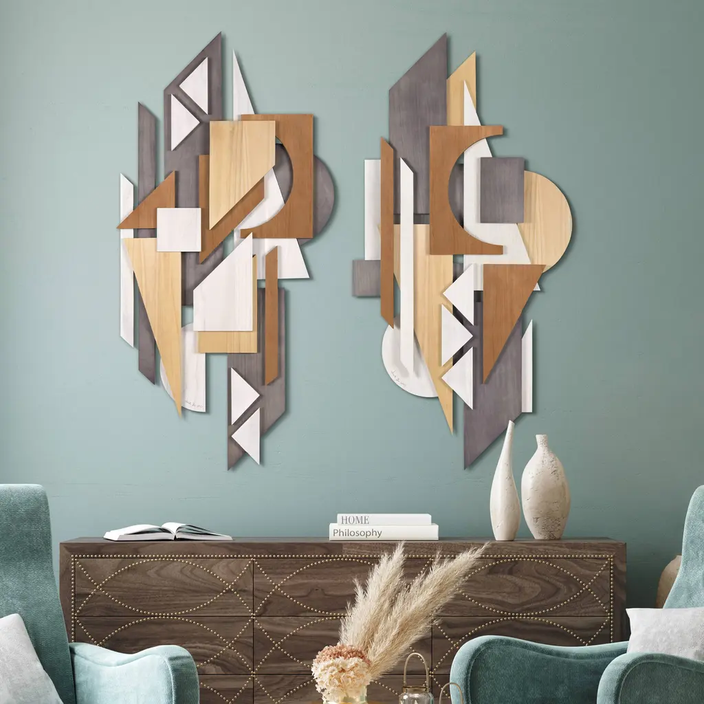Diptych Set - This abstract wall sculpture set is a masterpiece of intricate design, created from a variety of differently-shaped pieces but predominantly pointed shapes of solid paulownia wood. They are arranged in a way that creates a sense of fluidity, like an arrow in motion. The colors of these sculptures are a beautiful mix of sandy taupe, alabaster, natural wood and smokey gray, giving them a sense of depth and contrast. Laser engraved with the artist Jane Yu's signature, this diptych can be hunged horizontally or vertically to surely give your walls a chick look. Please note that since these abstracts are made from real solid wood, the colors and patterns will be unique in each sculpture. Therefore, the image shown may be slightly different from the actual artwork.