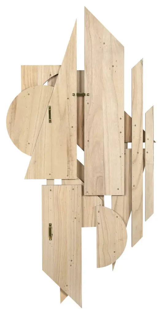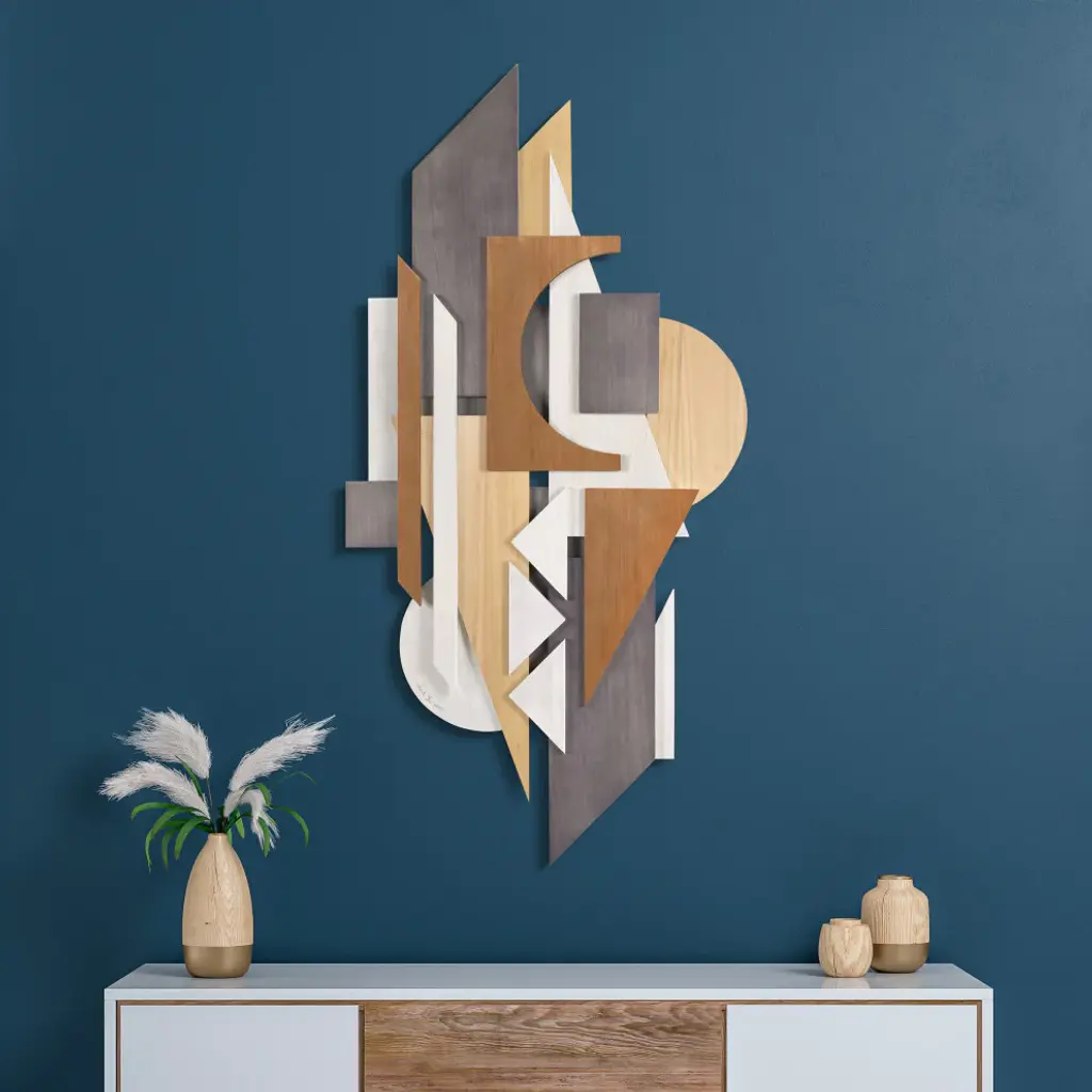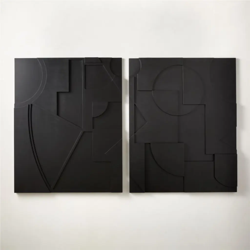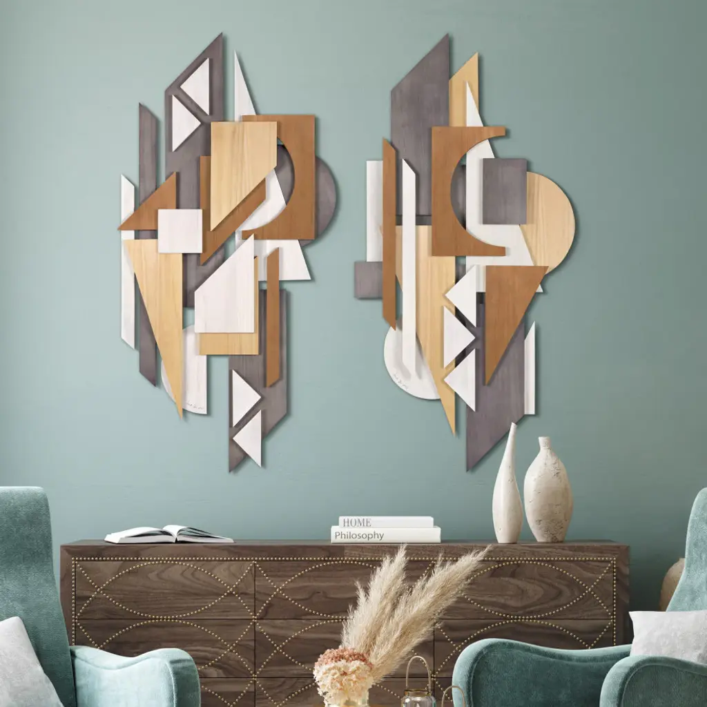 Diptych Set - This abstract wall sculpture set is a masterpiece of intricate design, created from a variety of differently-shaped pieces but predominantly pointed shapes of solid paulownia wood. They are arranged in a way that creates a sense of fluidity, like an arrow in motion. The colors of these sculptures are a beautiful mix of sandy taupe, alabaster, natural wood and smokey gray, giving them a sense of depth and contrast. Laser engraved with the artist Jane Yu''s signature, this diptych can be hunged horizontally or vertically to surely give your walls a chick look. Please note that since these abstracts are made from real solid wood, the colors and patterns will be unique in each sculpture. Therefore, the image shown may be slightly different from the actual artwork.