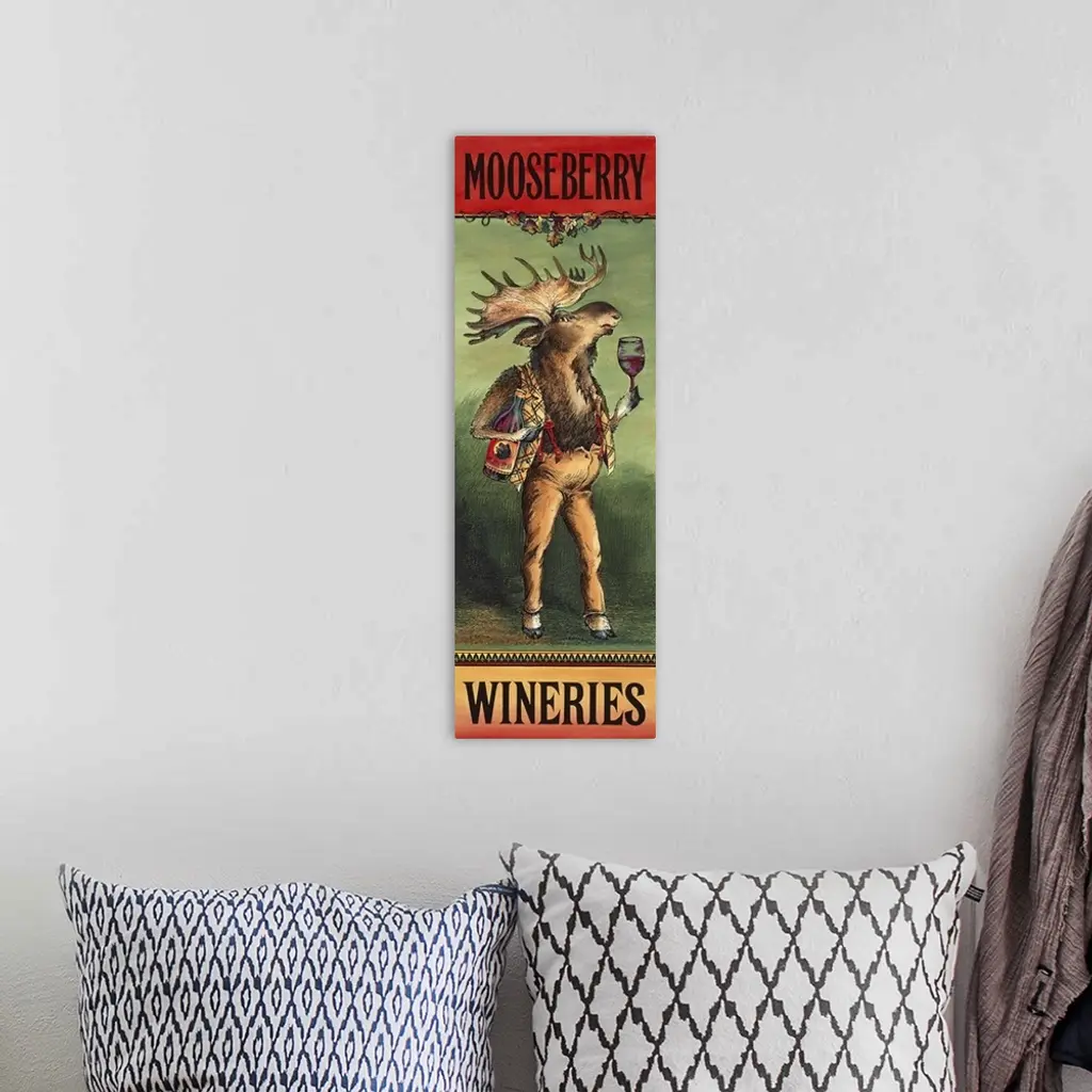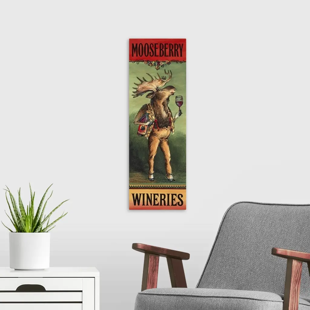 Tall and narrow painting on canvas of a moose holding a bottle of wine in one hand and a glass of wine in the other.