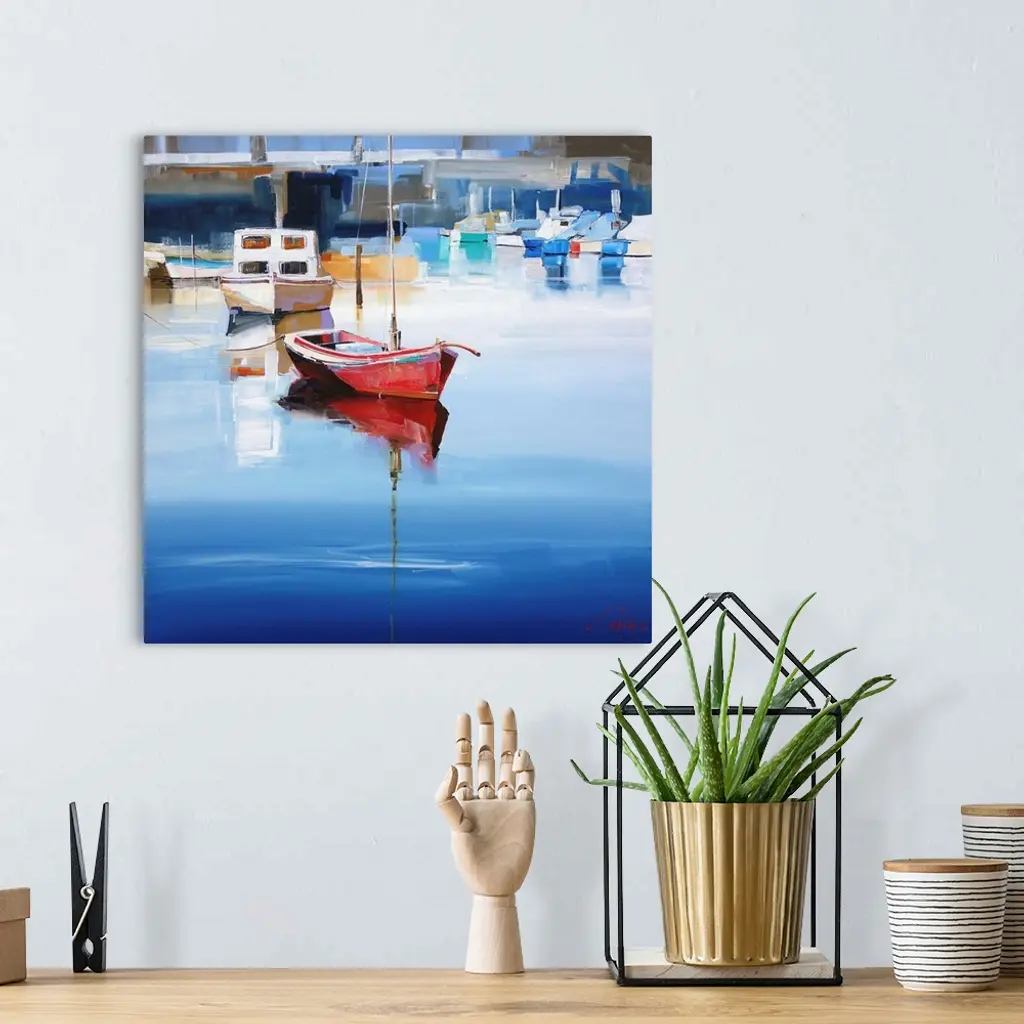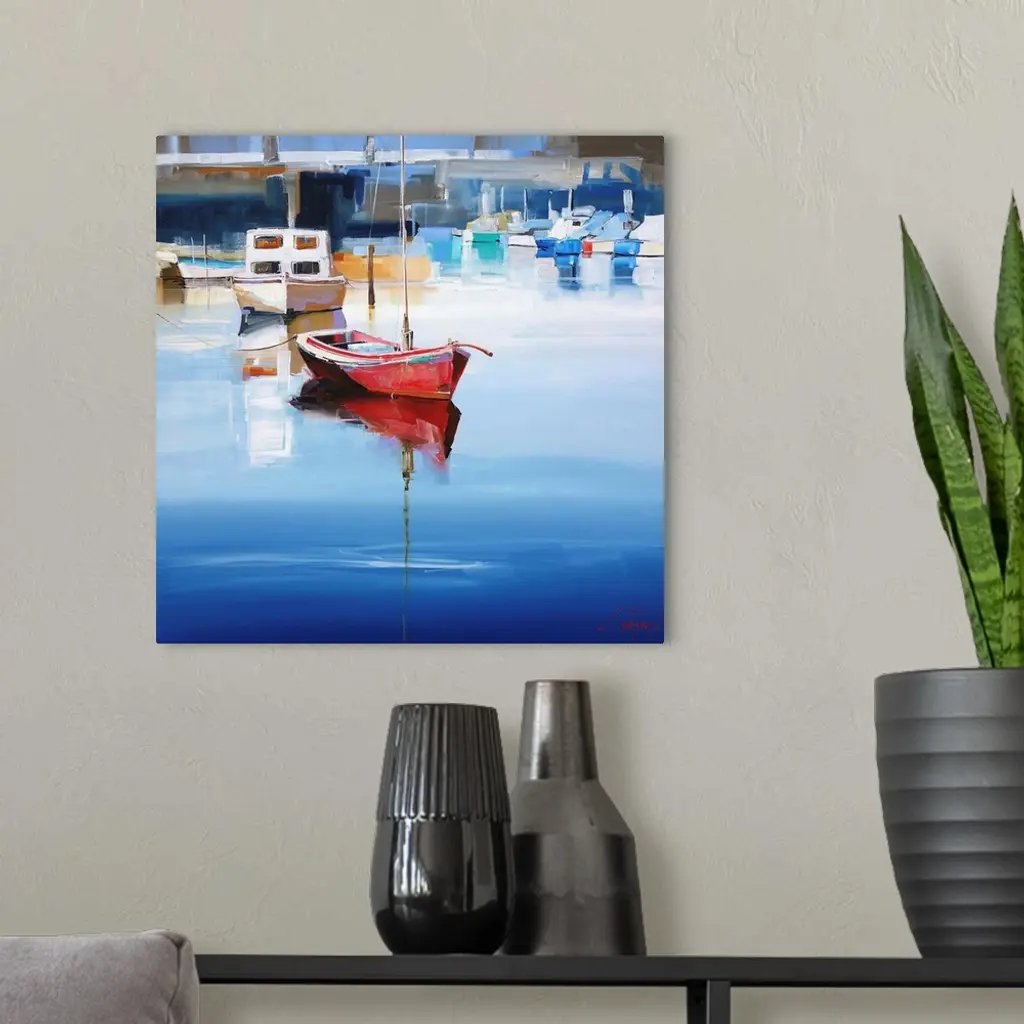 A contemporary painting of a red sailboat tied at a bock dock a long with other boats.