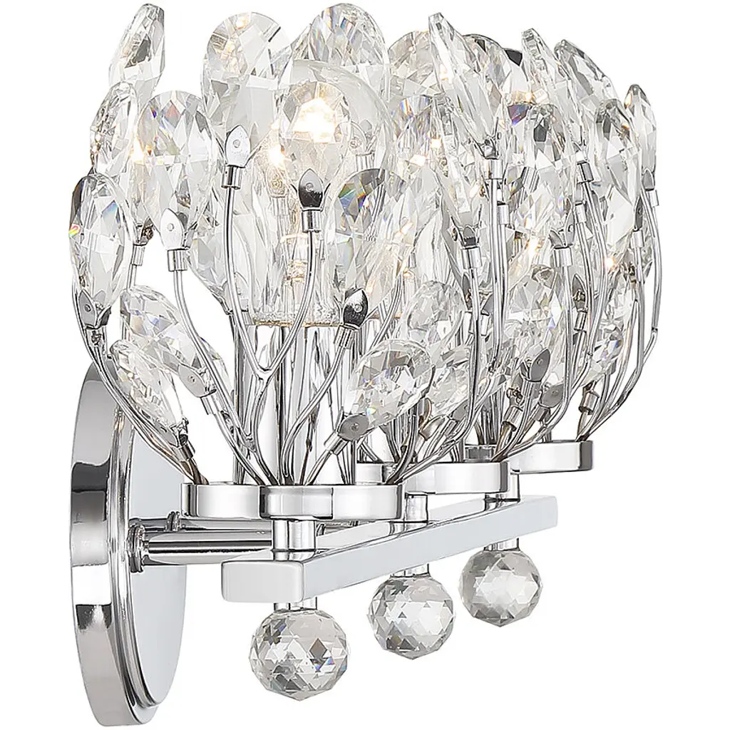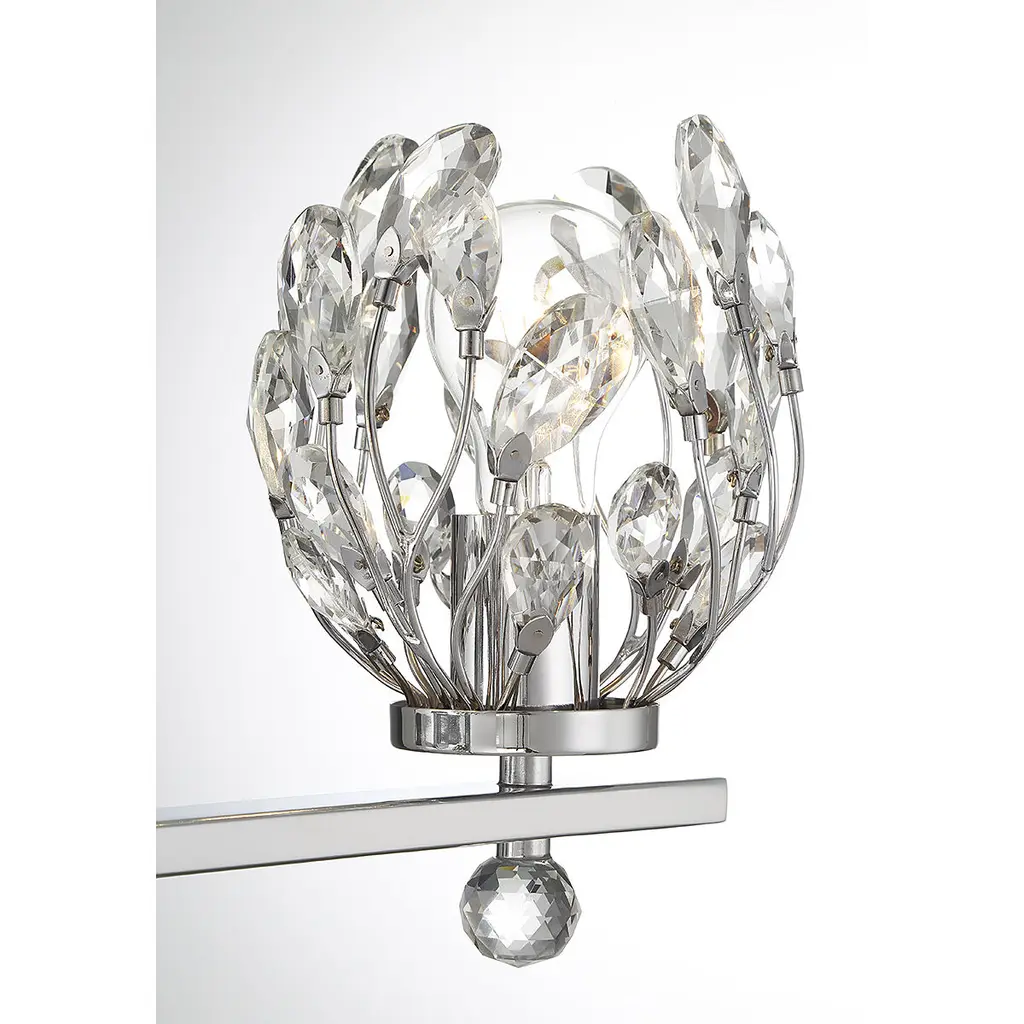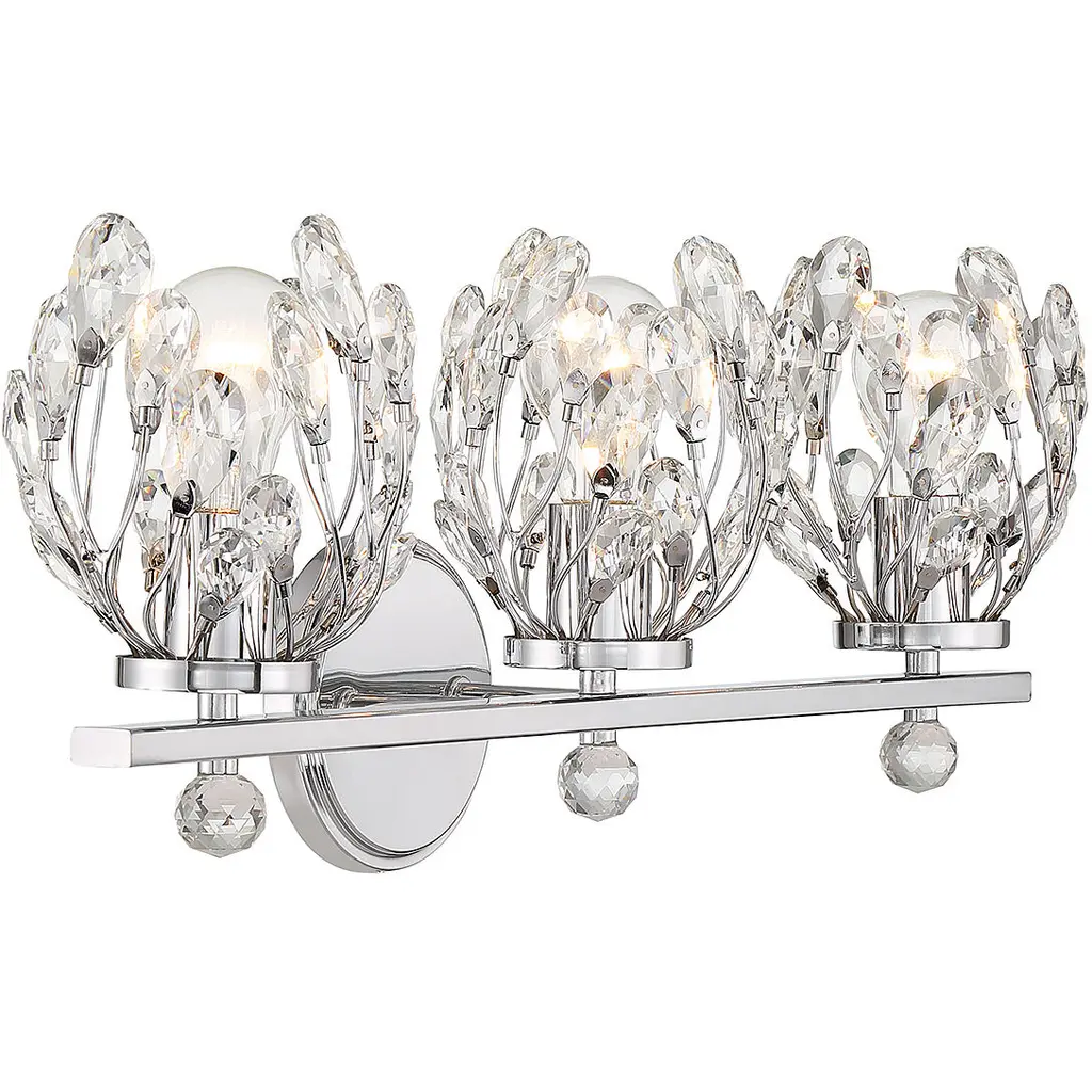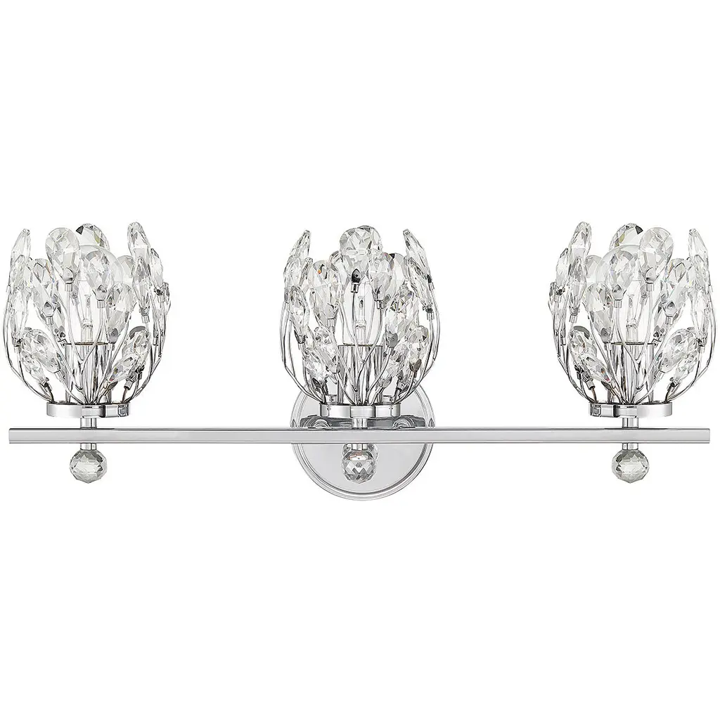 Give your bathroom its flowers with the whimsical Savoy House Moreno 3-light bath vanity light. Metal stems topped with clear crystal buds surround each light to create a look that is always fresh and fun, whether the lights are on or off. Finished in chrome. Moreno is 9.5" in height, 23.5" in width and extends 6.75" from the wall. It uses 3 standard size bulbs of up to 60 watts per bulb (bulbs not included).