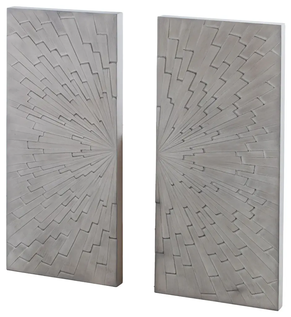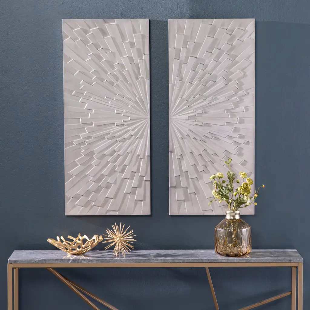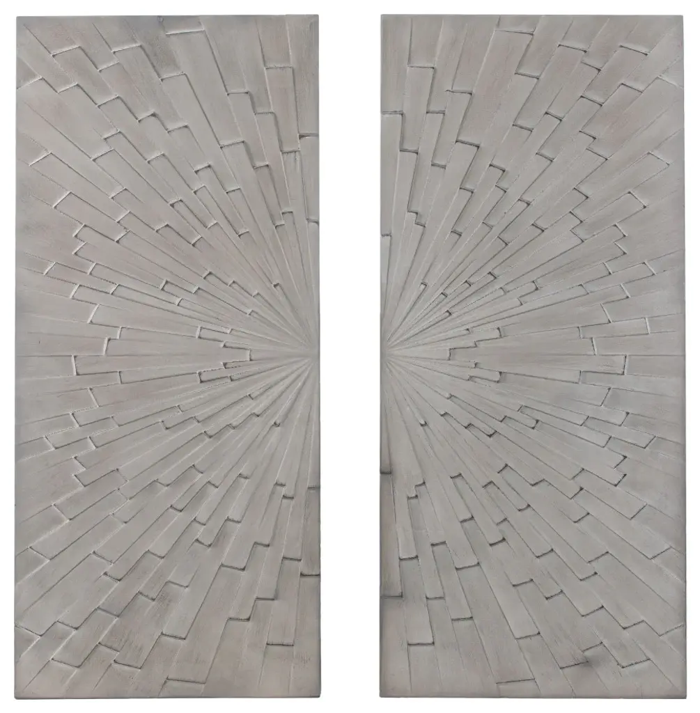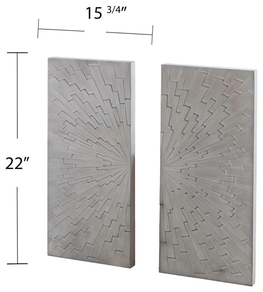 Capture a textured look this two-piece wall art set. The raised design creates a unique sunburst pattern, while the graywashed finish adds a contemporary feel to your home. Hanging vertically or horizontally, these decorative wall panels work together as an accent piece in your entryway or separately to create a cohesive look throughout your open concept space. Add a dimensional focal point to your living room or dining room this wall Decor set.