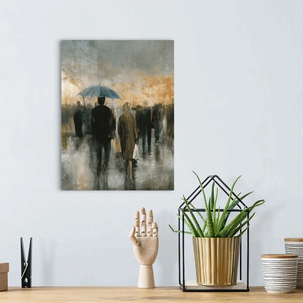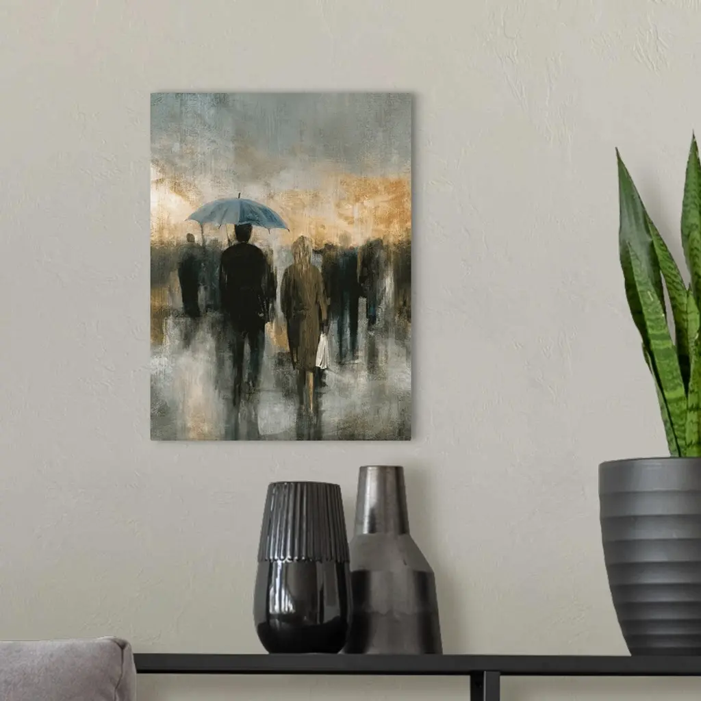 Contemporary artwork of a couple walking in the city with an umbrella.