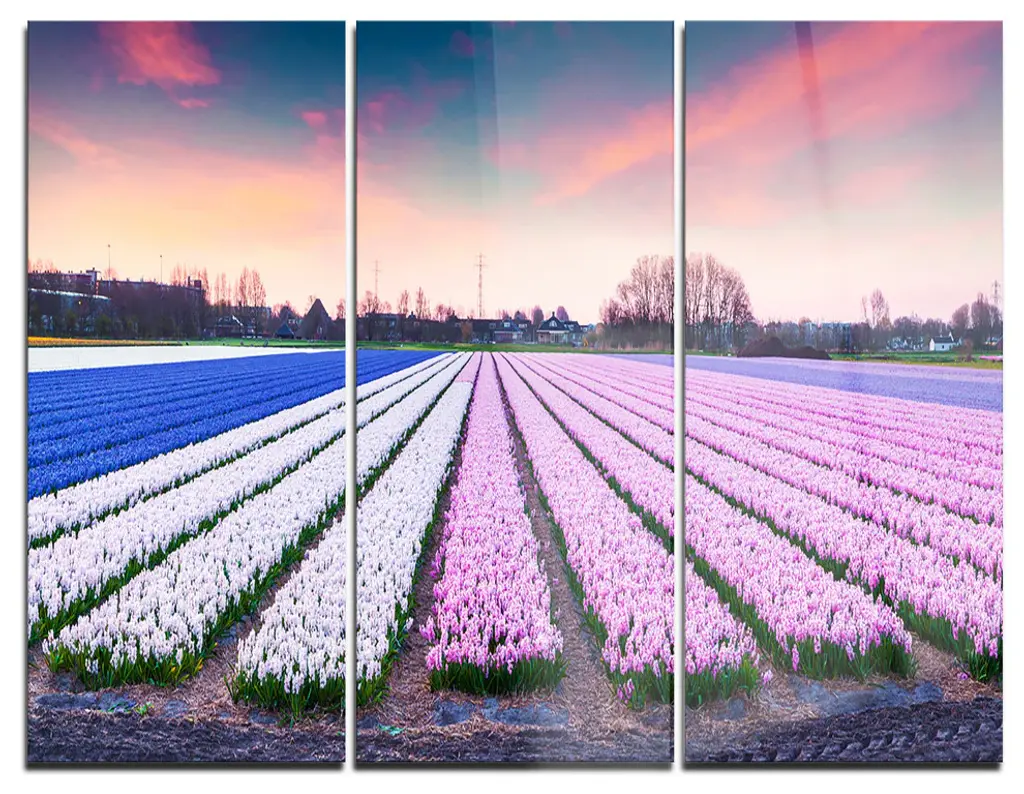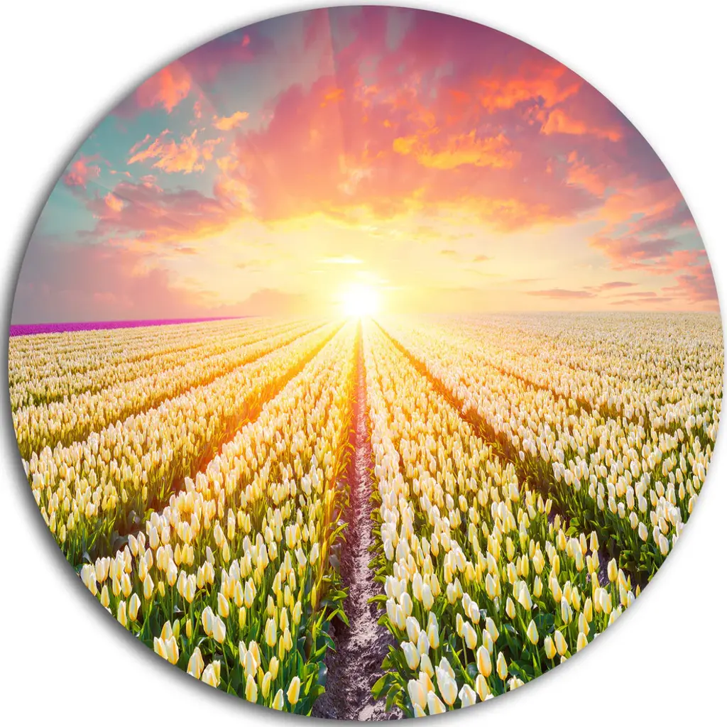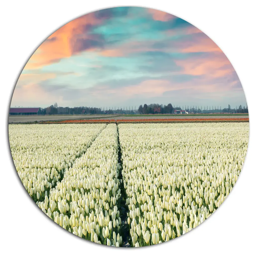 Bring Contemporary Abstraction to your home with this large Circle Metal wall art. This Morning in Tulip Farm Near Espel Village Metal Artwork makes it the focal point of any room or office. - White Gloss Coating ensures colors are extra vibrant with light reflection.- Aluminum grade Sheet Metal with 1 inch mounting frame on the back giving the illusion that the artwork is floating on the wall..- Mounting Brackets are included along with instructions.- High Quality Digital images are created directly into a glossy aluminum panel producing a stunning and captivating print into the glossy finish of the metal.- Water, Fire and Scratch resistant HD Aluminum panels.- Looks better than any photo paper and guaranteed to last at least 20 years- Easy to clean with a microfiber cloth. Colors are far superior to regular Canvas Art. - Easy to Hang