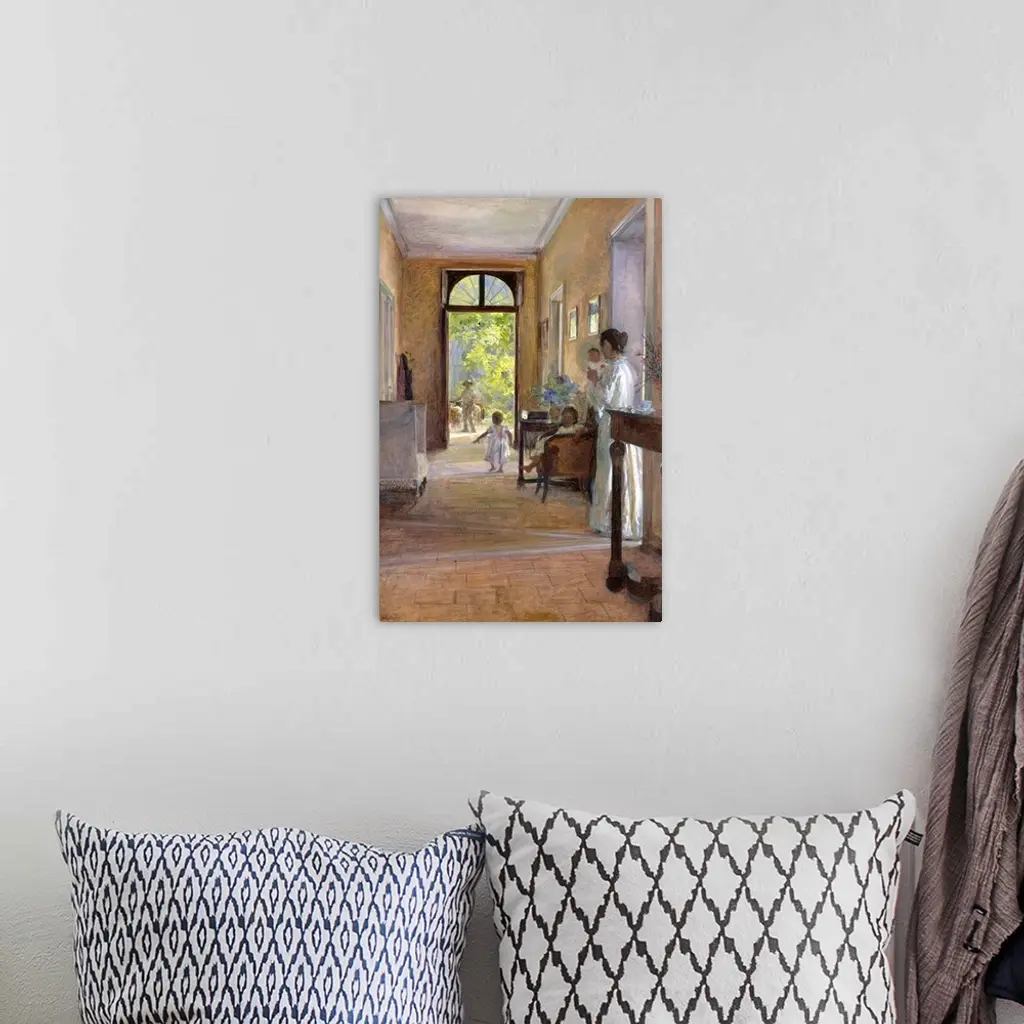 This this 19th century painting shows an idyllic family scene of an open hallway in a family home full over children.