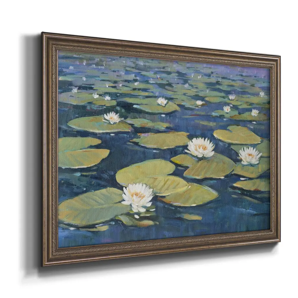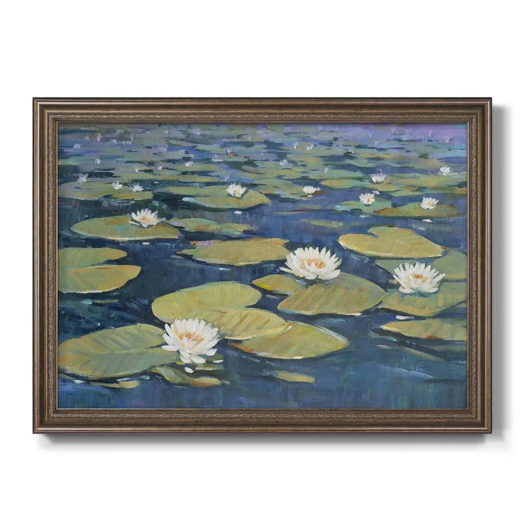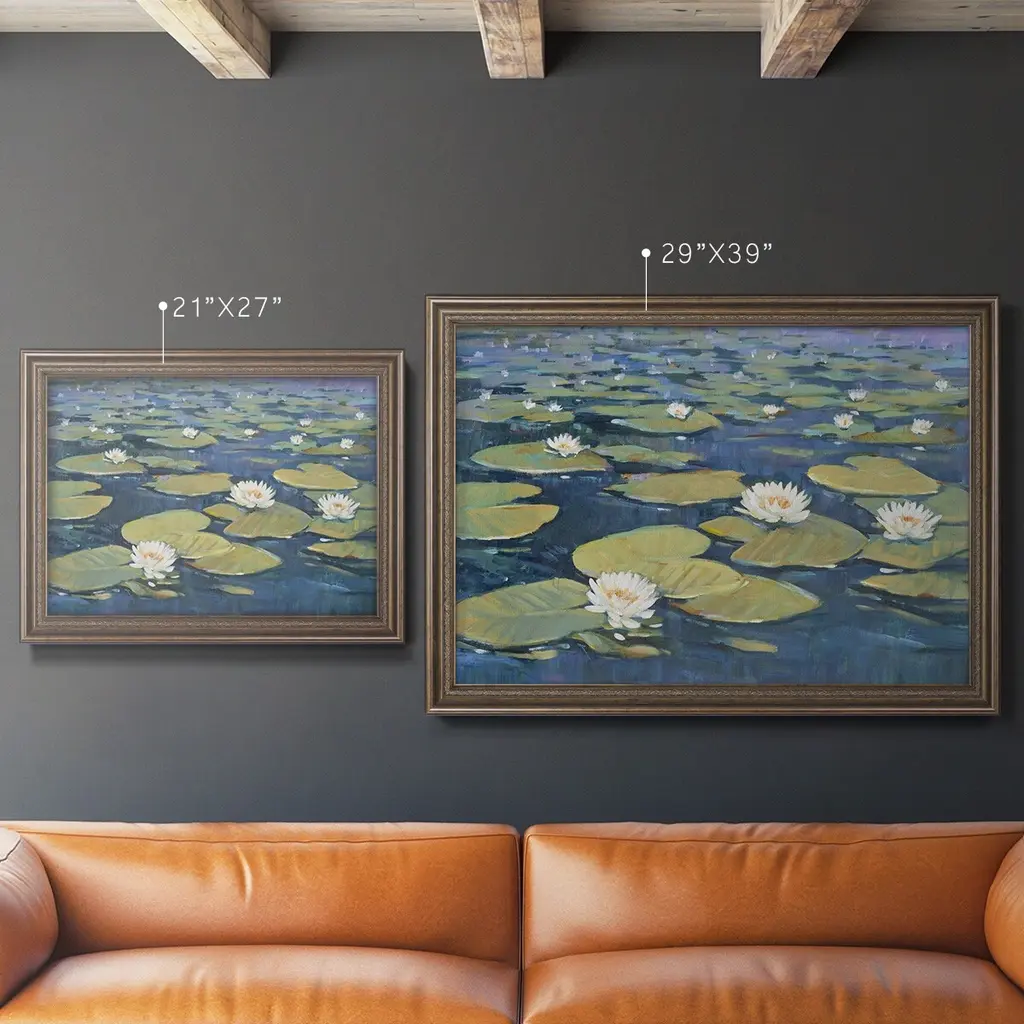 Morning Lilies I Premium Framed Canvas- Ready to Hang A Premium Framed Canvas created to last. Framed in distressed wood and available in an array of sizes and colors Featuring a beveled a solid wood stretcher bar, each piece comes ready to hand 3 SIZES AVAILABLE 16''X20'' - Overall Size 18'X27'' - Overall Size 24''x36'' - Overall Size Each piece is made to order. Each piece comes with hanging hardware. Made in the USA Ready to Hang Giclee Paper Print Acrylic Glass Beveled Matt Board