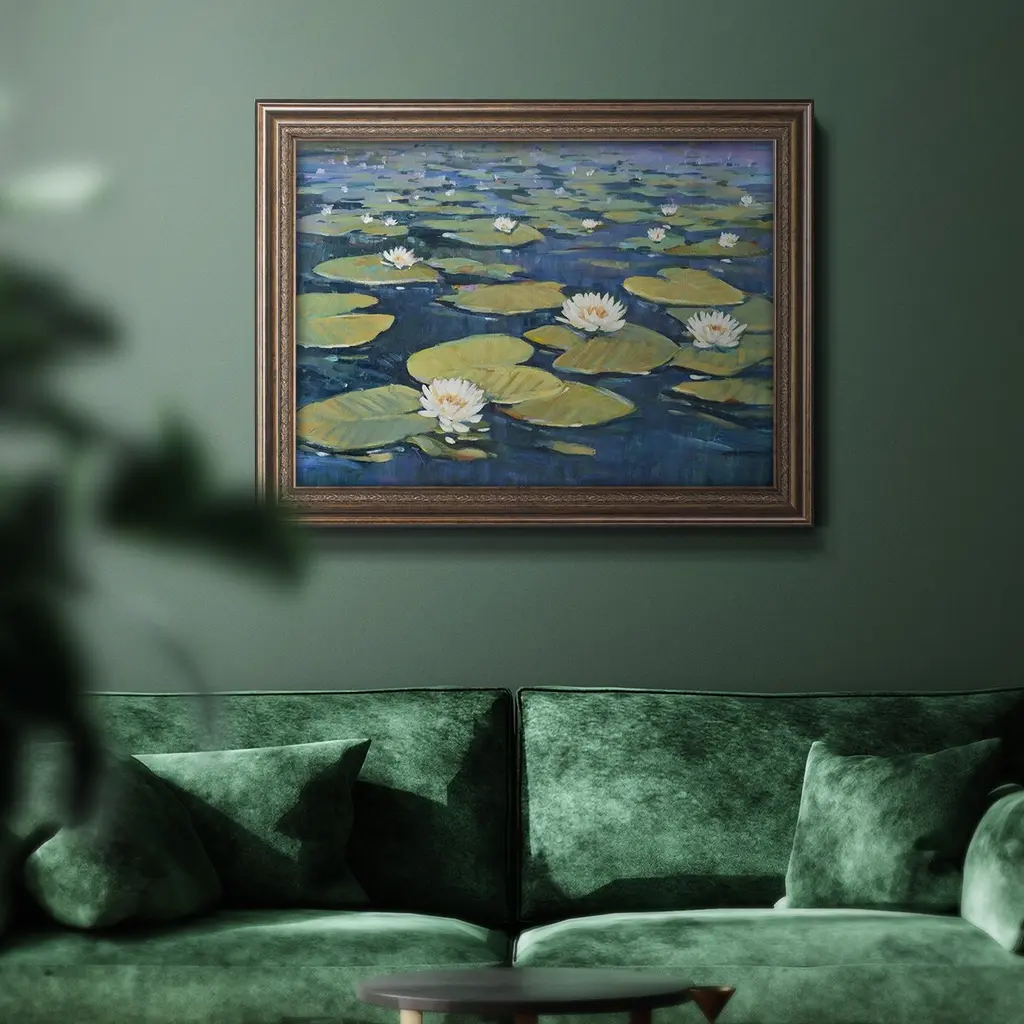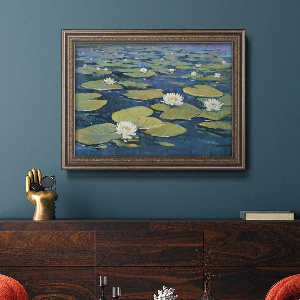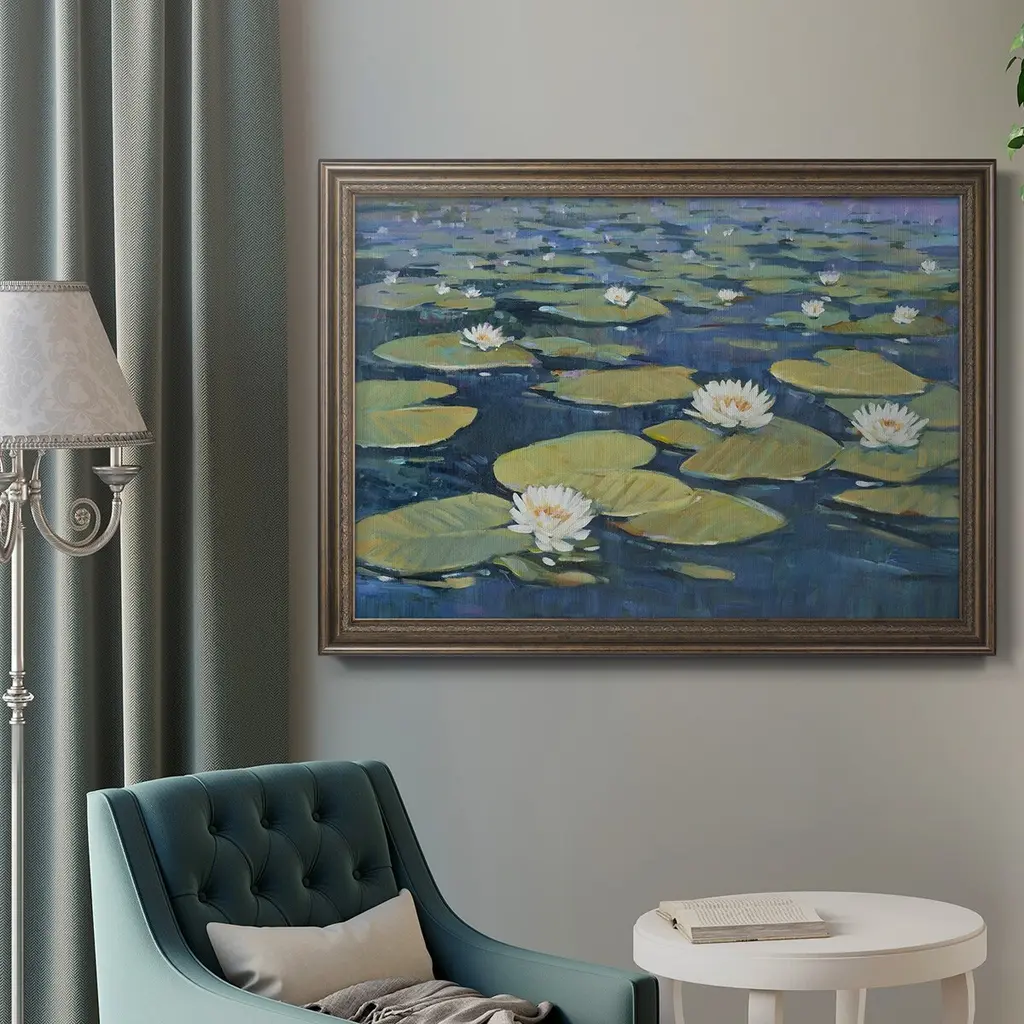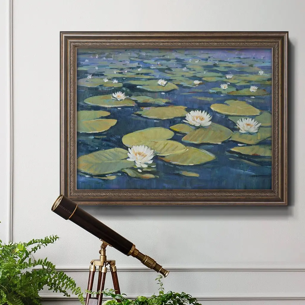 Morning Lilies I Premium Framed Canvas- Ready to Hang A Premium Framed Canvas created to last. Framed in distressed wood and available in an array of sizes and colors Featuring a beveled a solid wood stretcher bar, each piece comes ready to hand 3 SIZES AVAILABLE 16''X20'' - Overall Size 18'X27'' - Overall Size 24''x36'' - Overall Size Each piece is made to order. Each piece comes with hanging hardware. Made in the USA Ready to Hang Giclee Paper Print Acrylic Glass Beveled Matt Board