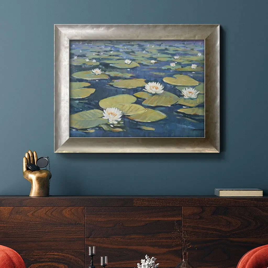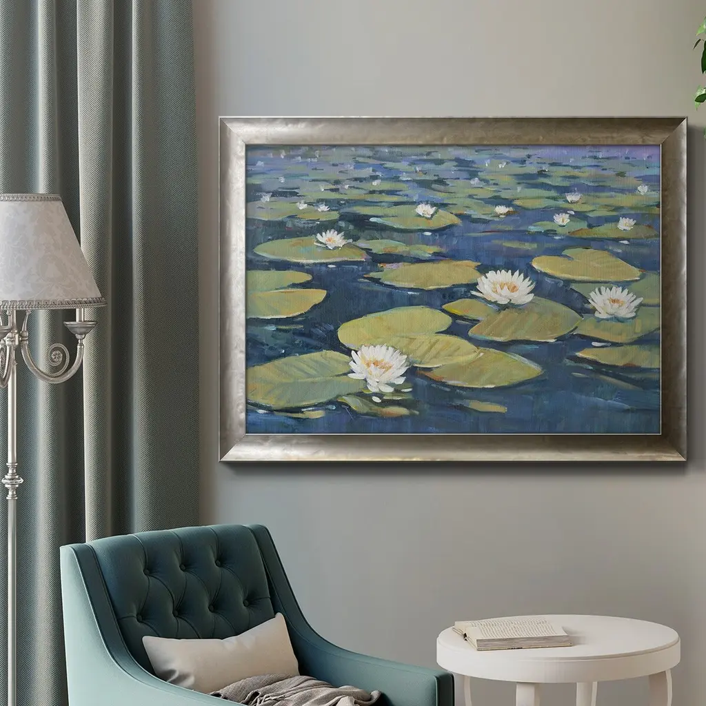 Morning Lilies I Premium Framed Canvas- Ready to Hang A Premium Framed Canvas created to last. Framed in distressed wood and available in an array of sizes and colors Featuring a beveled a solid wood stretcher bar, each piece comes ready to hand 3 SIZES AVAILABLE 16''X20'' - Overall Size 18'X27'' - Overall Size 24''x36'' - Overall Size Each piece is made to order. Each piece comes with hanging hardware. Made in the USA Ready to Hang Giclee Paper Print Acrylic Glass Beveled Matt Board