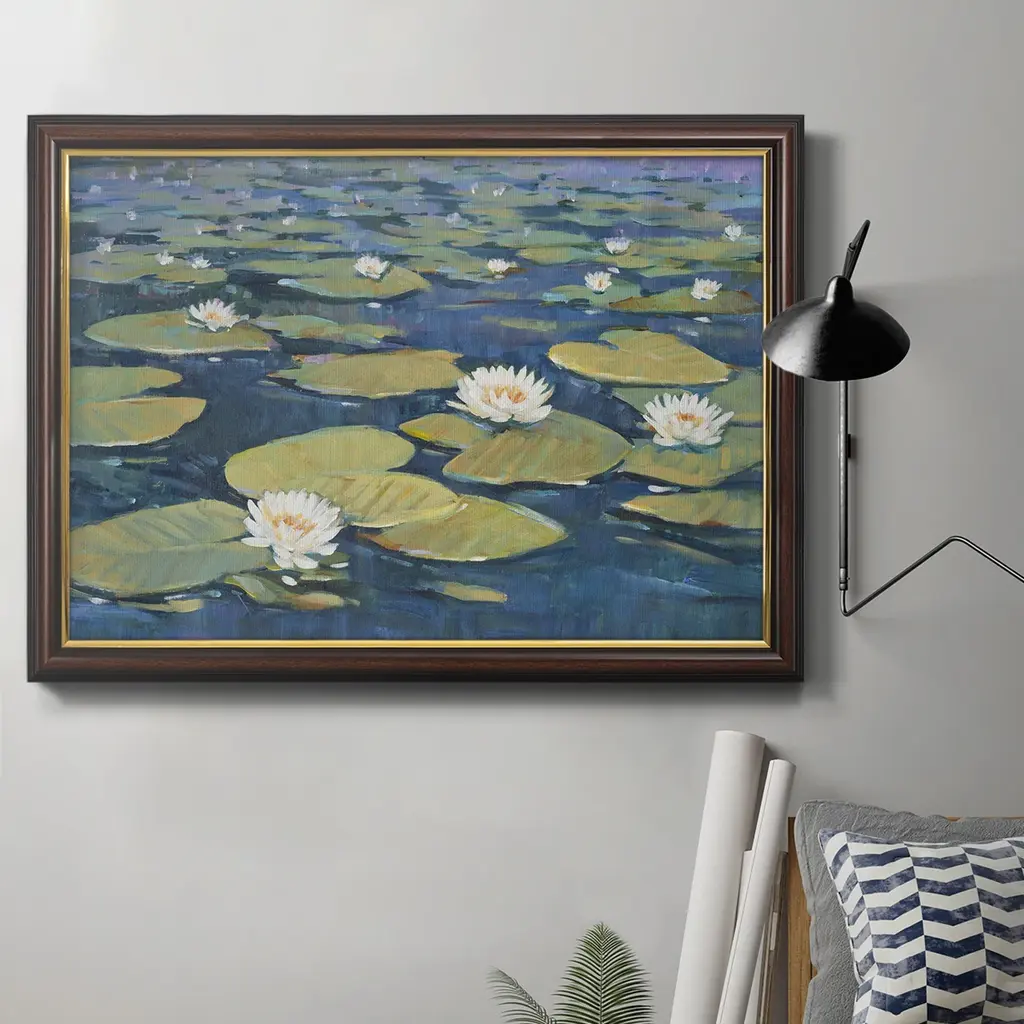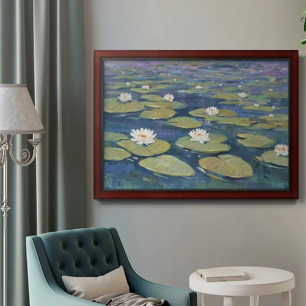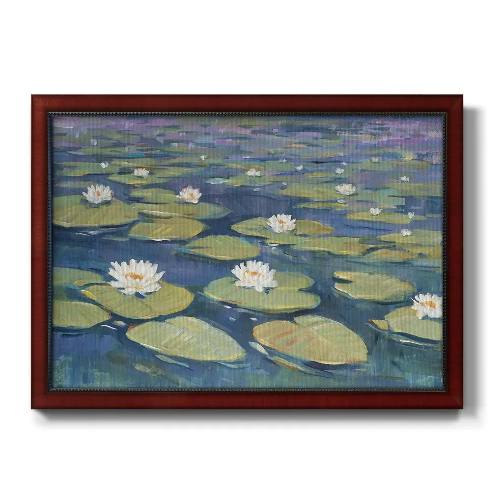Morning Lilies II Premium Framed Canvas- Ready to Hang A Premium Framed Canvas created to last. Framed in distressed wood and available in an array of sizes and colors Featuring a beveled a solid wood stretcher bar, each piece comes ready to hand 3 SIZES AVAILABLE 16''X20'' - Overall Size 18'X27'' - Overall Size 24''x36'' - Overall Size Each piece is made to order. Each piece comes with hanging hardware. Made in the USA Ready to Hang Giclee Paper Print Acrylic Glass Beveled Matt Board