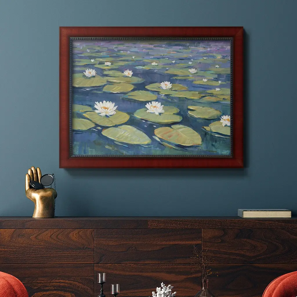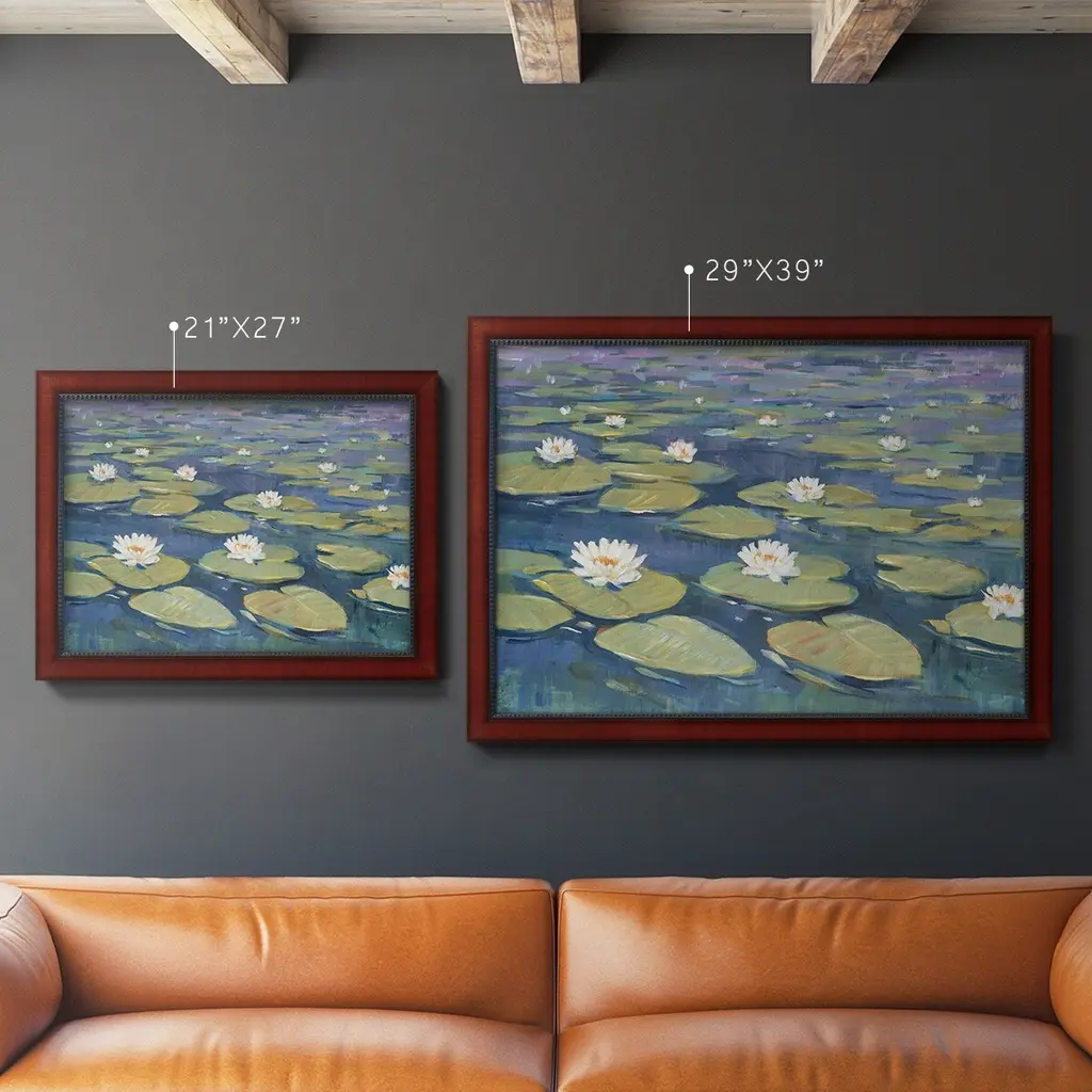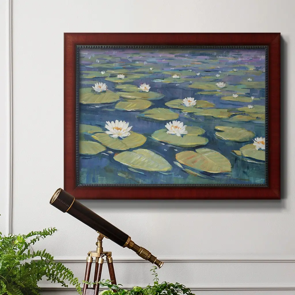 Morning Lilies II Premium Framed Canvas- Ready to Hang A Premium Framed Canvas created to last. Framed in distressed wood and available in an array of sizes and colors Featuring a beveled a solid wood stretcher bar, each piece comes ready to hand 3 SIZES AVAILABLE 16''X20'' - Overall Size 18'X27'' - Overall Size 24''x36'' - Overall Size Each piece is made to order. Each piece comes with hanging hardware. Made in the USA Ready to Hang Giclee Paper Print Acrylic Glass Beveled Matt Board