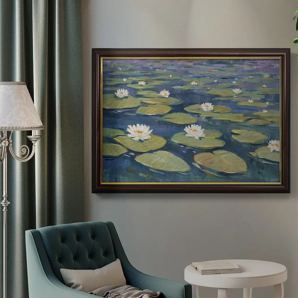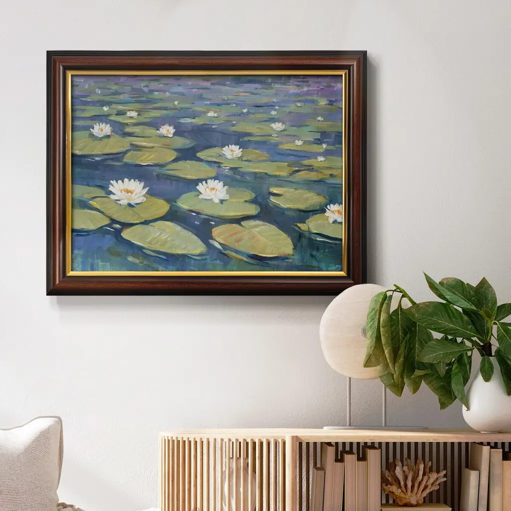 Morning Lilies II Premium Framed Canvas- Ready to Hang A Premium Framed Canvas created to last. Framed in distressed wood and available in an array of sizes and colors Featuring a beveled a solid wood stretcher bar, each piece comes ready to hand 3 SIZES AVAILABLE 16''X20'' - Overall Size 18'X27'' - Overall Size 24''x36'' - Overall Size Each piece is made to order. Each piece comes with hanging hardware. Made in the USA Ready to Hang Giclee Paper Print Acrylic Glass Beveled Matt Board