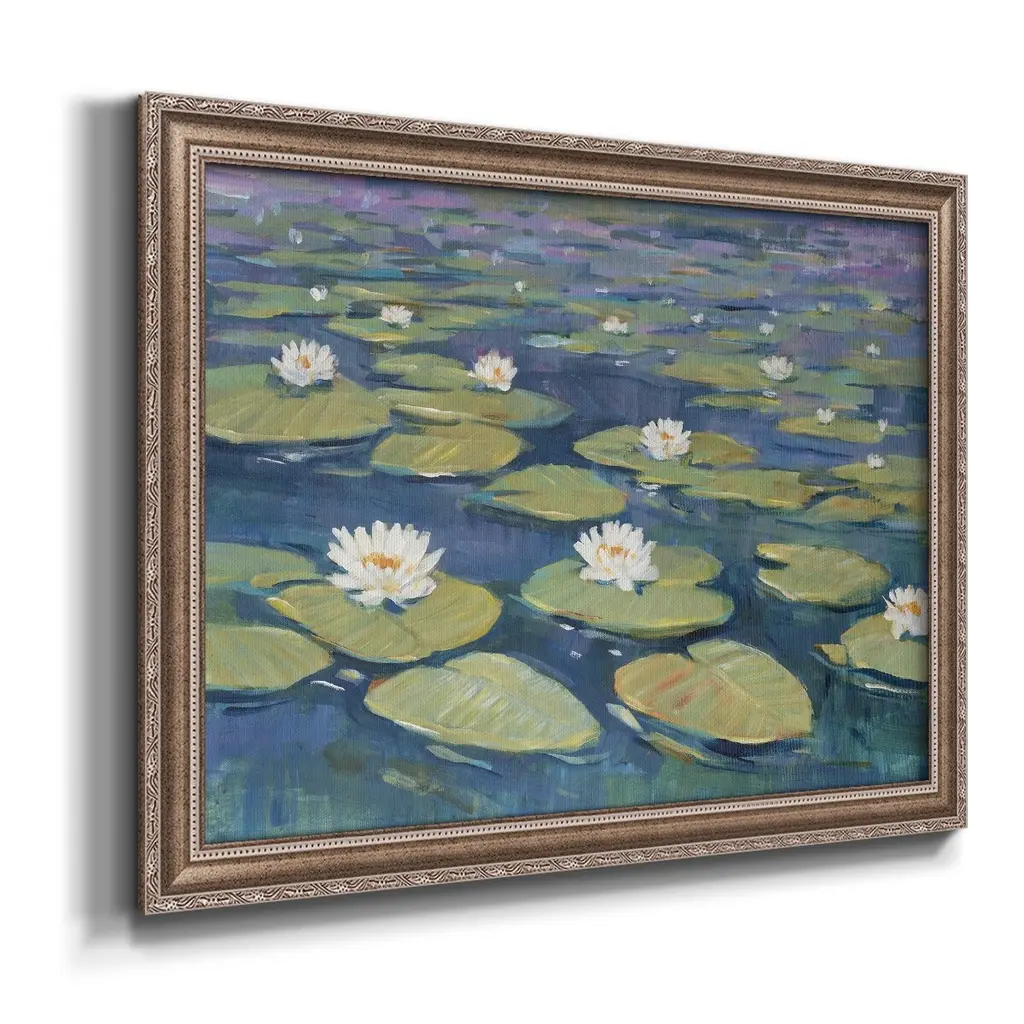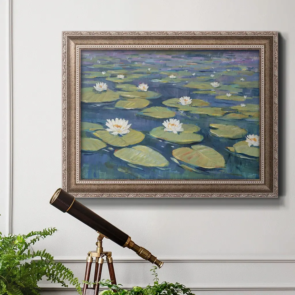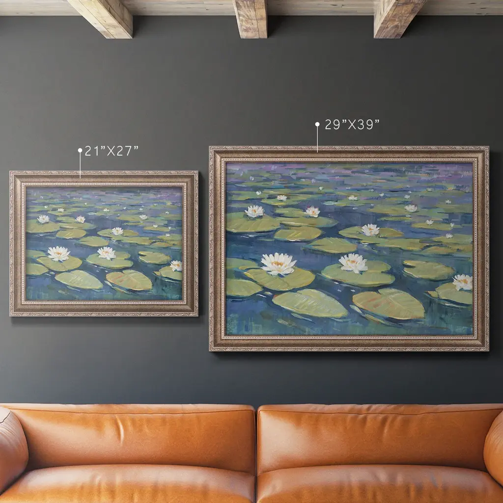 Morning Lilies II Premium Framed Canvas- Ready to Hang A Premium Framed Canvas created to last. Framed in distressed wood and available in an array of sizes and colors Featuring a beveled a solid wood stretcher bar, each piece comes ready to hand 3 SIZES AVAILABLE 16''X20'' - Overall Size 18'X27'' - Overall Size 24''x36'' - Overall Size Each piece is made to order. Each piece comes with hanging hardware. Made in the USA Ready to Hang Giclee Paper Print Acrylic Glass Beveled Matt Board