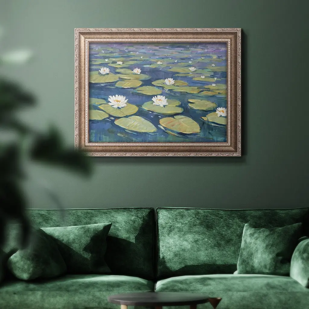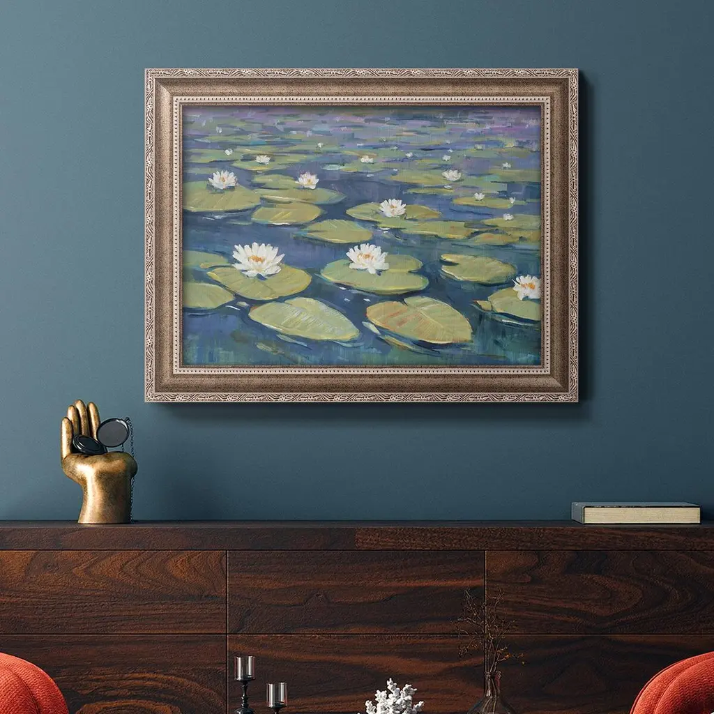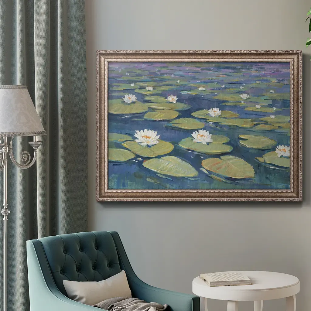Morning Lilies II Premium Framed Canvas- Ready to Hang A Premium Framed Canvas created to last. Framed in distressed wood and available in an array of sizes and colors Featuring a beveled a solid wood stretcher bar, each piece comes ready to hand 3 SIZES AVAILABLE 16''X20'' - Overall Size 18'X27'' - Overall Size 24''x36'' - Overall Size Each piece is made to order. Each piece comes with hanging hardware. Made in the USA Ready to Hang Giclee Paper Print Acrylic Glass Beveled Matt Board