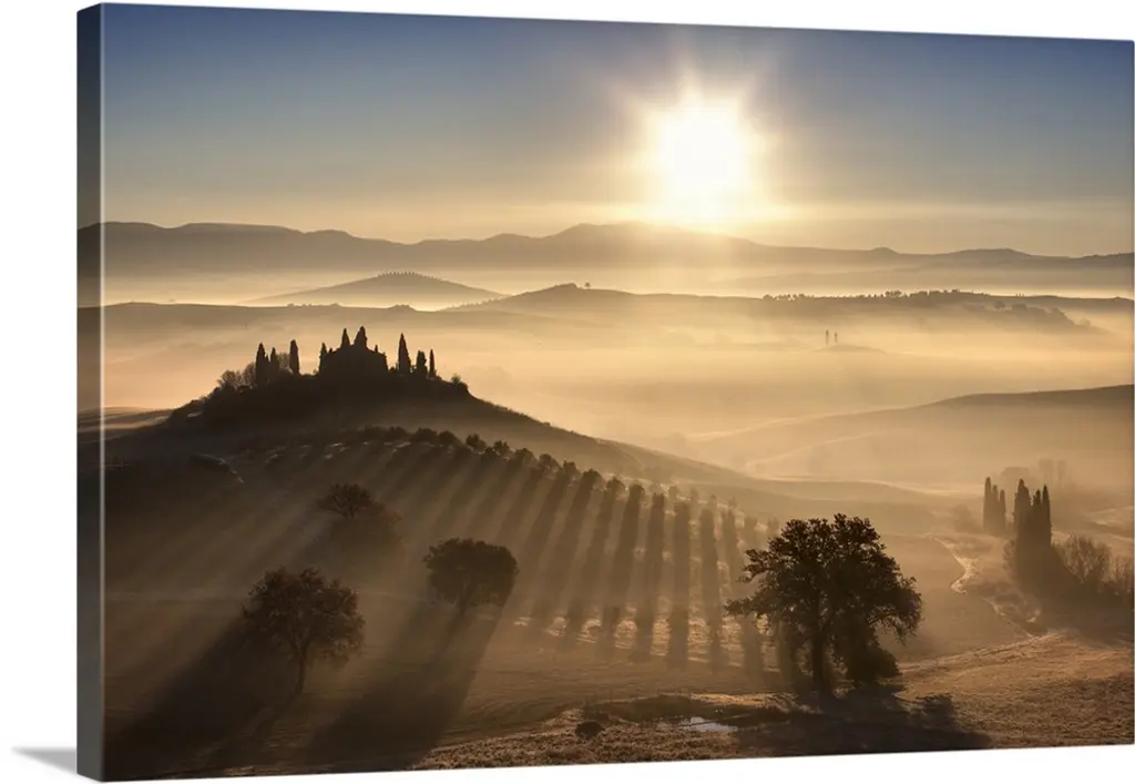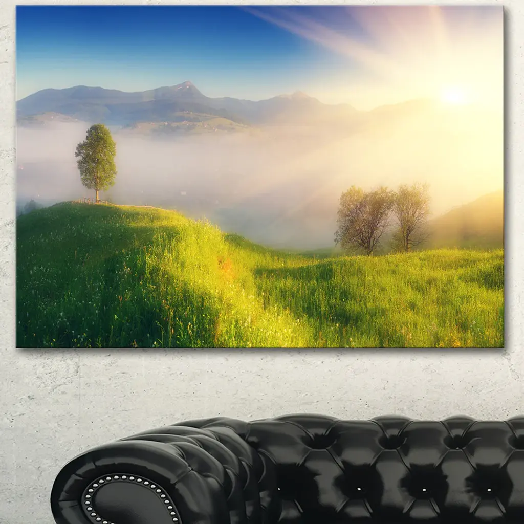 Morning Mist Over Mountain Village, Landscape Canvas Art Print, 60"x28"