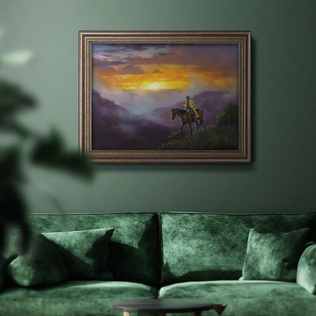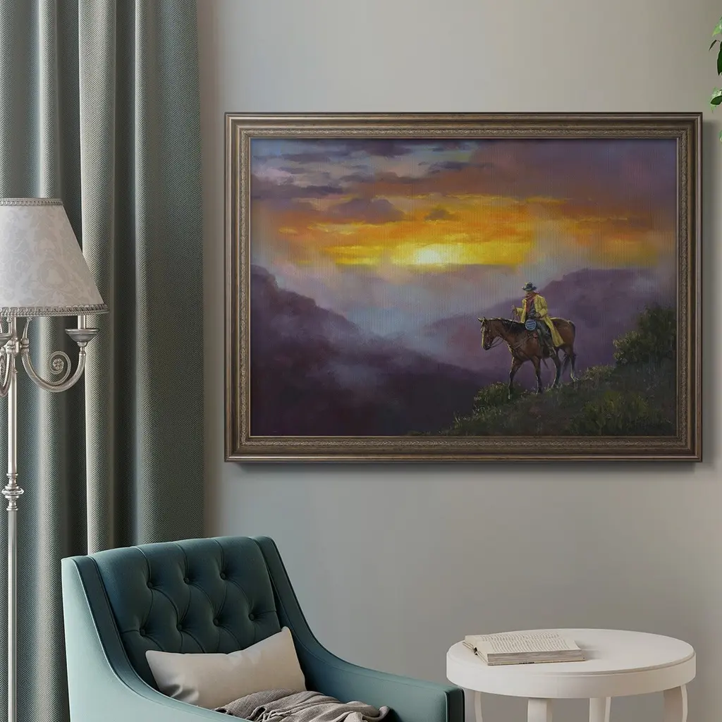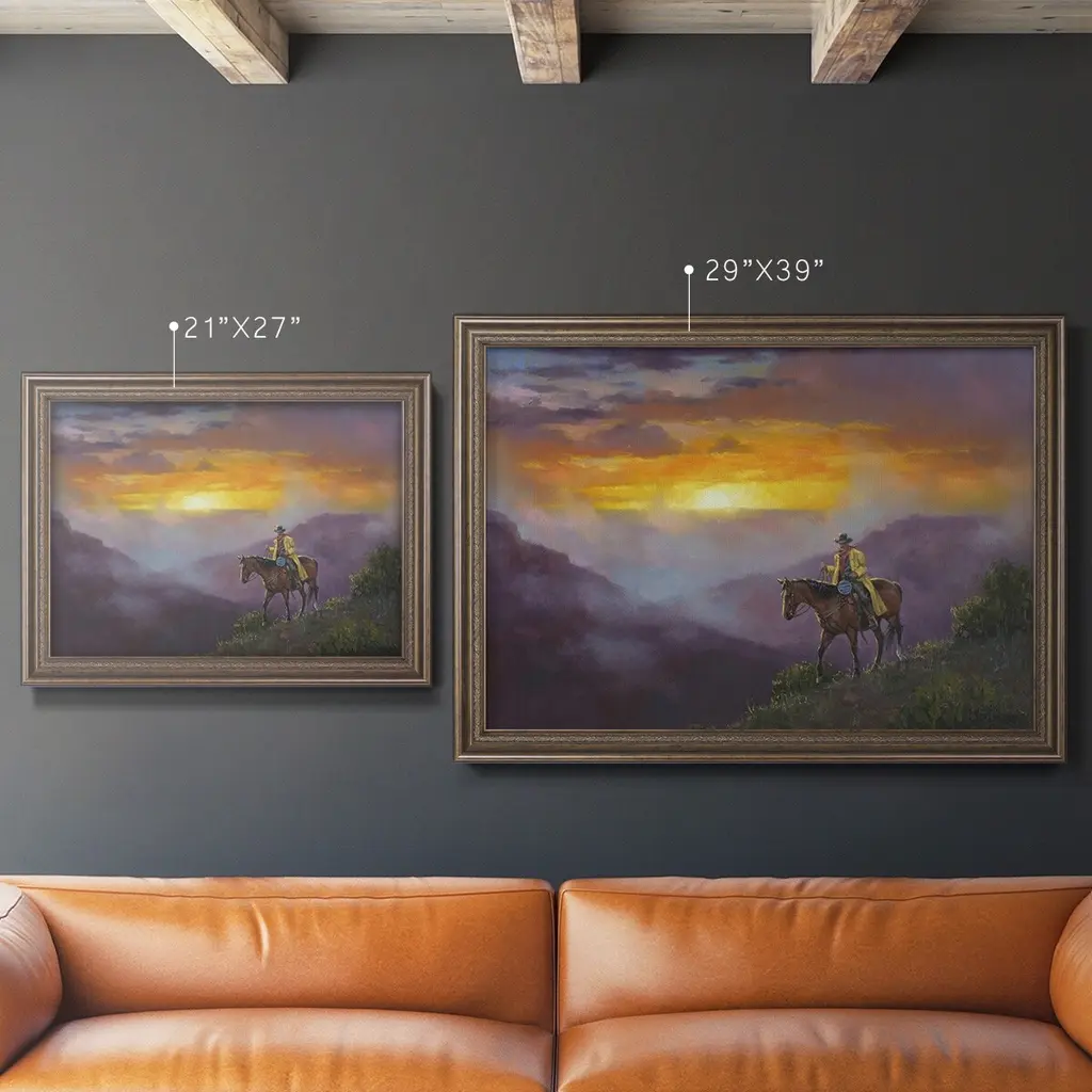 Morning Mist Premium Framed Canvas- Ready to Hang A Premium Framed Canvas created to last. Framed in distressed wood and available in an array of sizes and colors Featuring a beveled a solid wood stretcher bar, each piece comes ready to hand 3 SIZES AVAILABLE 16''X20'' - Overall Size 18'X27'' - Overall Size 24''x36'' - Overall Size Each piece is made to order. Each piece comes with hanging hardware. Made in the USA Ready to Hang Giclee Paper Print Acrylic Glass Beveled Matt Board