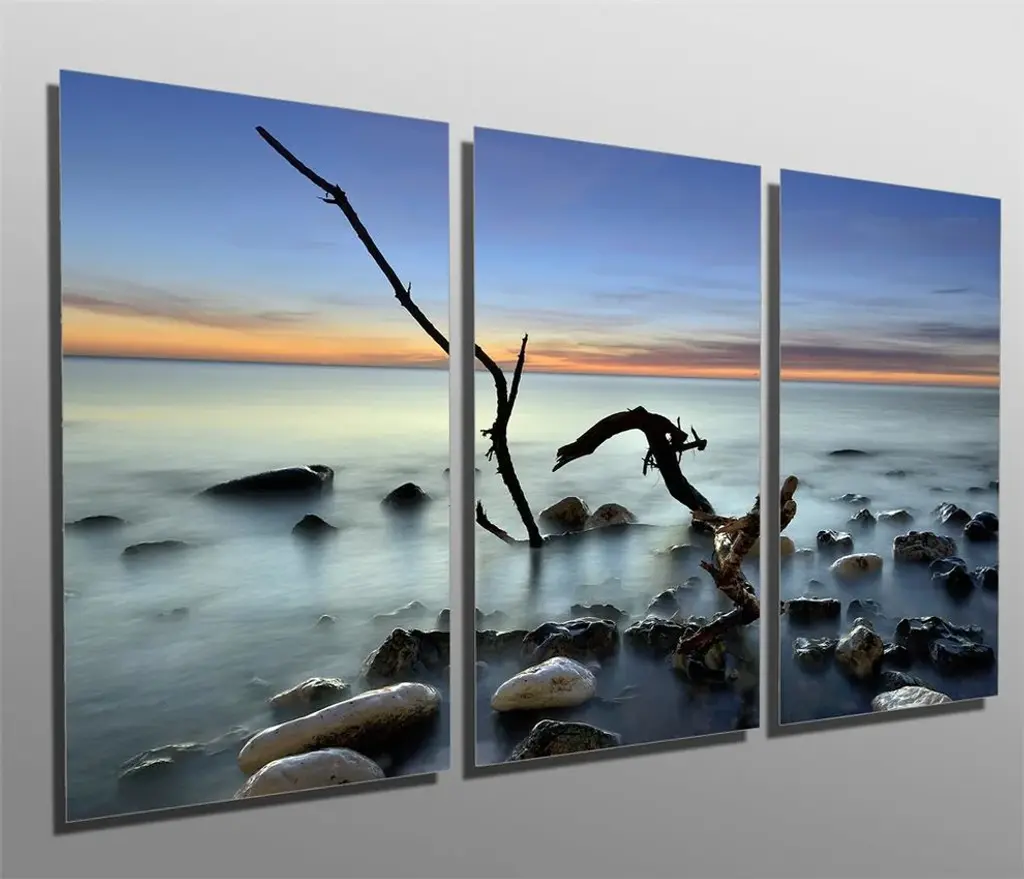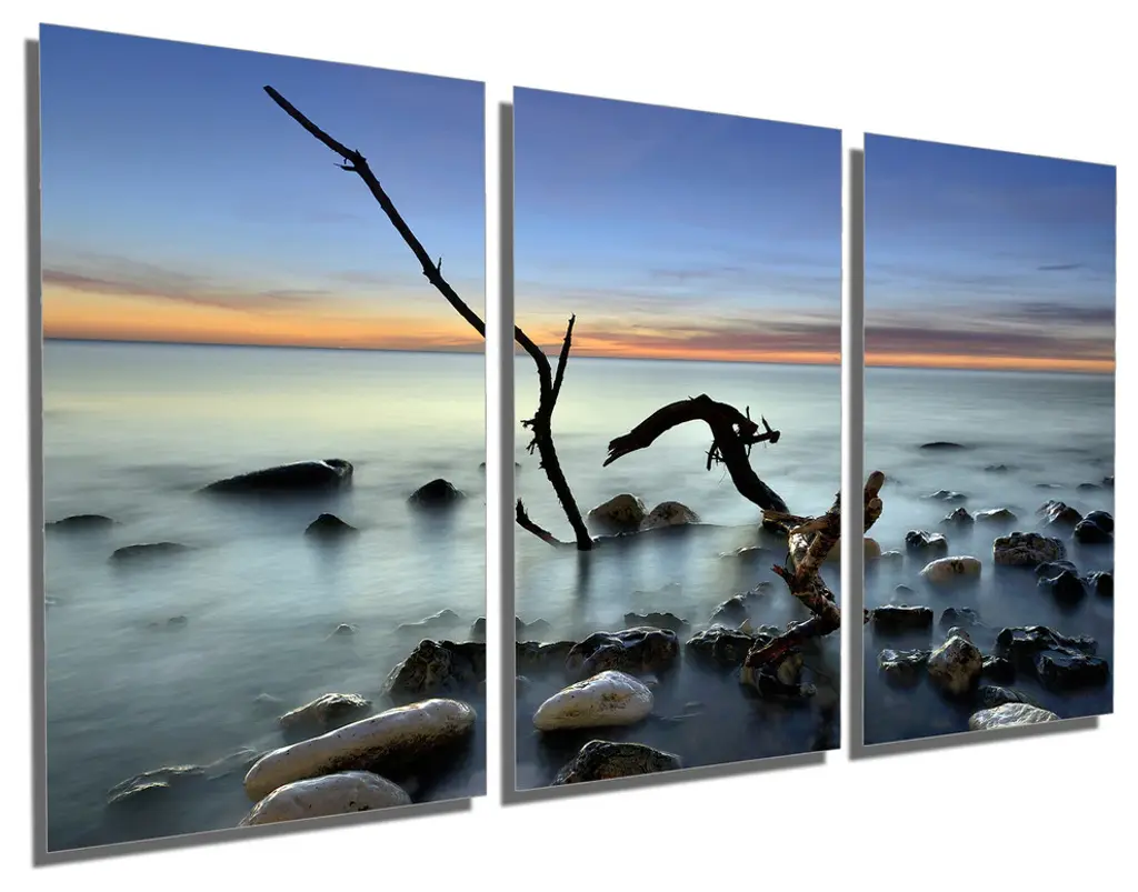 48"œ x 24"œ total size. Ready To Hang! (3 pieces - 16"œ x 24"œ each). 3 Panel Split (Triptych) Metal Print with early morning seacoast rocks hugged by mist + a tree branch. Modern metal wall art for home or office wall decor & interior design. Printed on Luxurious, HD aluminum glossy metal panels. Multi panel art.. HD aluminum panels. Metal print wall art. Includes Shadow Wall Mount on the back.• Aluminum Metal Wall Art• Made in USA• Ready to hang - No assembly required• Shadow mount hardware on the back• 0.045"œ thick HD Aluminum Panels• Scratch resistant, glossy finish• Superb color clarity, luxurious prints• Epson printing process• For indoor or moisture rich environment use• Easy to clean. Gently wipe with microfiber cloth.