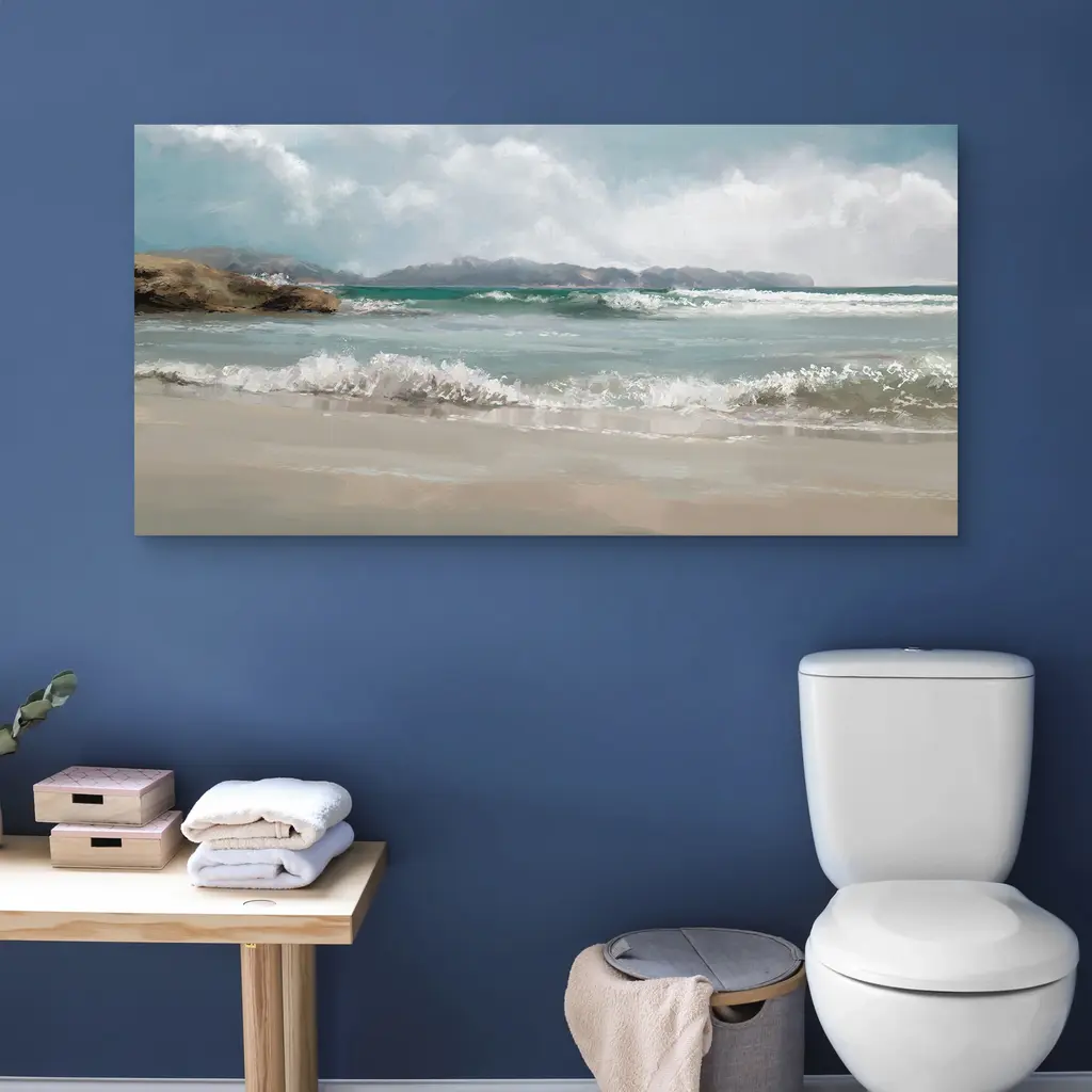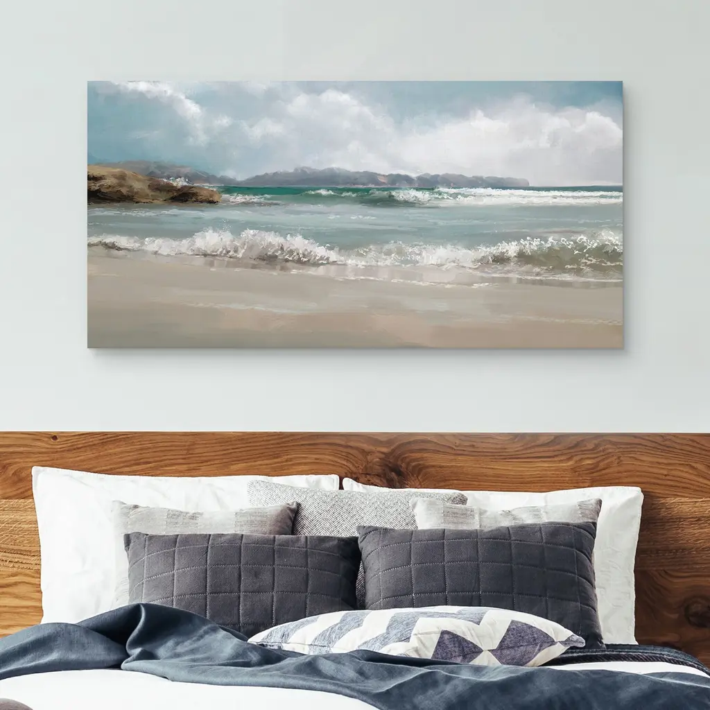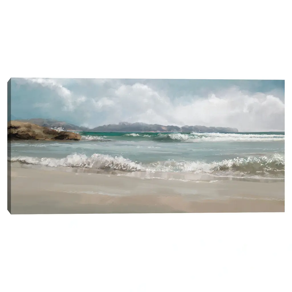 Waves crash against the sandy shore, leaving sprays of seafoam in their wake in this enticing canvas print. The gentle tumult of the ocean is offset by the rolling clouds and weathered coast above, all of nature seemingly in agreement in this early morning scene. This premium giclee print is made with high-quality canvas material using cutting edge print technology. Offering full-bleed printing, which covers the entirety of the canvas, your new artwork will have that museum-quality look without the high price tag. Plus, your new masterpiece comes ready to hang: all you need are a few nails, a steady hand, and an eye for detail.