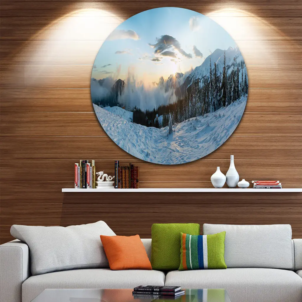 Bring Contemporary Abstraction to your home with this large Circle Metal wall art. This Morning Winter Carpathian Mountains Metal Artwork makes it the focal point of any room or office. - White Gloss Coating ensures colors are extra vibrant with light reflection.- Aluminum grade Sheet Metal with 1 inch mounting frame on the back giving the illusion that the artwork is floating on the wall..- Mounting Brackets are included along with instructions.- High Quality Digital images are created directly into a glossy aluminum panel producing a stunning and captivating print into the glossy finish of the metal.- Water, Fire and Scratch resistant HD Aluminum panels.- Looks better than any photo paper and guaranteed to last at least 20 years- Easy to clean with a microfiber cloth. Colors are far superior to regular Canvas Art. - Easy to Hang