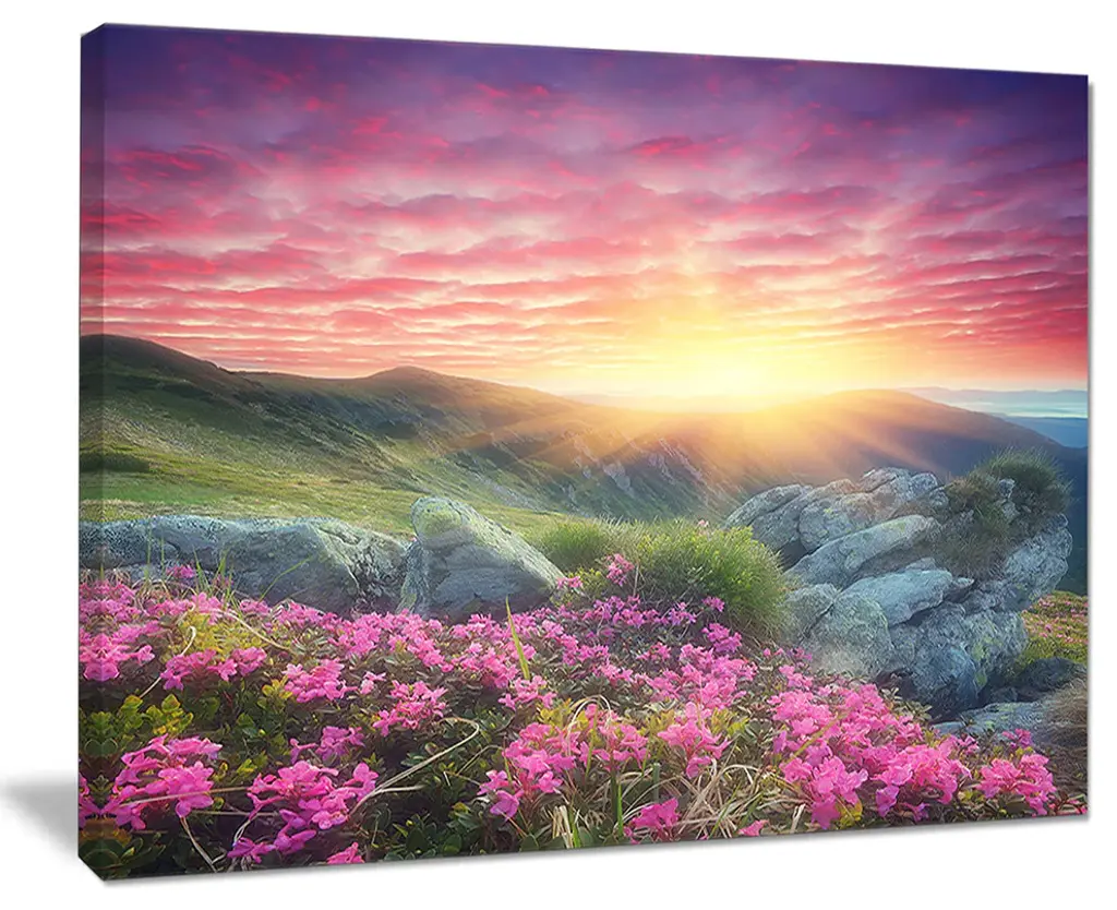 The Morning with Flowers in Mountains canvas art print is sure to make an impression on anyone who sees it. This artwork is gallery wrapped around a 1-inch solid wood frame and arrives carefully packaged and entirely ready to hang on the wall. Design Art only uses the highest resolution and pigments to ensure a crisp colorful print that is never faded or pixelated. This artwork is sure to be a conversation starter in any home or office.