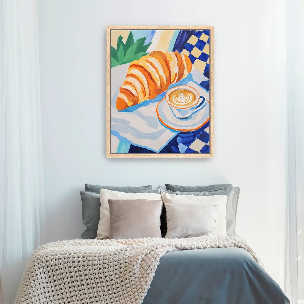 Bring the charm of a Parisian breakfast nook to your home with this cozy canvas art featuring a golden croissant and frothy cappuccino. The warm brushwork and rich tones evoke comfort, indulgence, and the simple joy of slow mornings. Our Gallery Wrap Canvas Prints are proudly assembled with high quality materials in California, USA. Each piece is printed on a thick, archival grade canvas using Giclee technology. It is then hand-stretched by our experienced artisans over solid wood bars, which will not warp over time. The final product is a piece personally crafted for you to confidently display on your wall. Care and Assembly: Ensure that the location of your piece has little to no exposure to heat, sunlight, and moisture. Wipe clean, only if needed. Each piece includes hanging hardware to hang on your wall vertically.