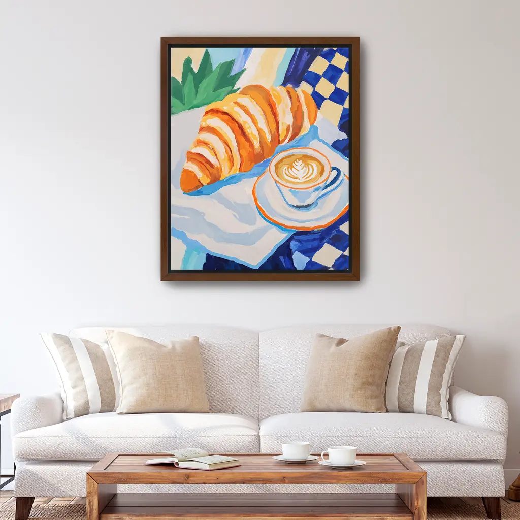 Bring the charm of a Parisian breakfast nook to your home with this cozy canvas art featuring a golden croissant and frothy cappuccino. The warm brushwork and rich tones evoke comfort, indulgence, and the simple joy of slow mornings. Our Gallery Wrap Canvas Prints are proudly assembled with high quality materials in California, USA. Each piece is printed on a thick, archival grade canvas using Giclee technology. It is then hand-stretched by our experienced artisans over solid wood bars, which will not warp over time. The final product is a piece personally crafted for you to confidently display on your wall. Care and Assembly: Ensure that the location of your piece has little to no exposure to heat, sunlight, and moisture. Wipe clean, only if needed. Each piece includes hanging hardware to hang on your wall vertically.