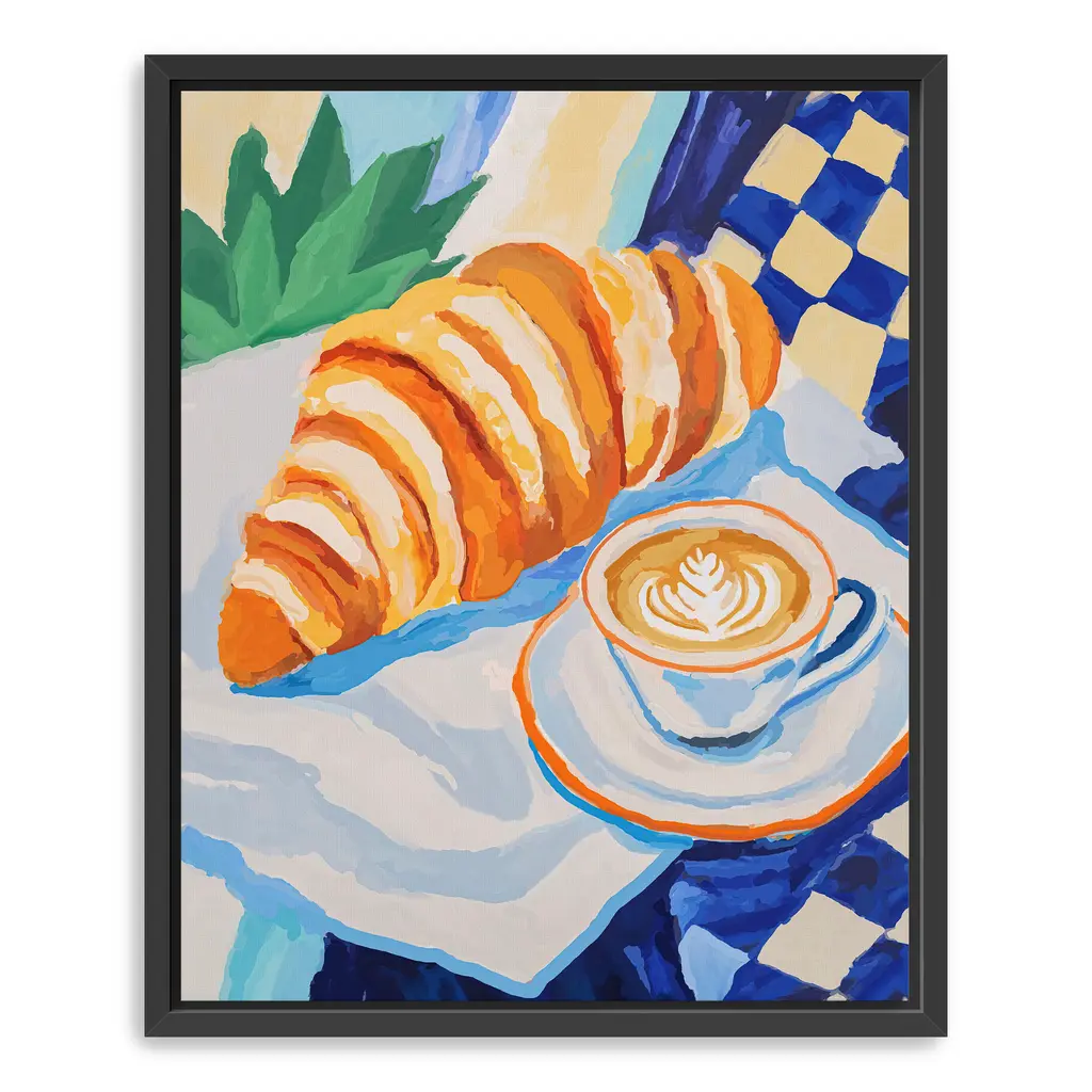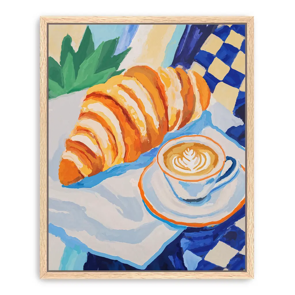Bring the charm of a Parisian breakfast nook to your home with this cozy canvas art featuring a golden croissant and frothy cappuccino. The warm brushwork and rich tones evoke comfort, indulgence, and the simple joy of slow mornings. Our Gallery Wrap Canvas Prints are proudly assembled with high quality materials in California, USA. Each piece is printed on a thick, archival grade canvas using Giclee technology. It is then hand-stretched by our experienced artisans over solid wood bars, which will not warp over time. The final product is a piece personally crafted for you to confidently display on your wall. Care and Assembly: Ensure that the location of your piece has little to no exposure to heat, sunlight, and moisture. Wipe clean, only if needed. Each piece includes hanging hardware to hang on your wall vertically.