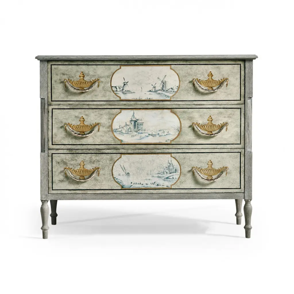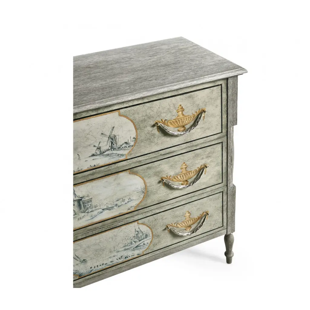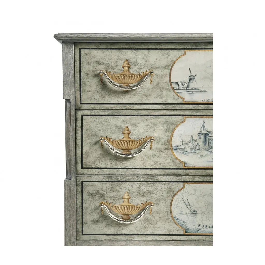 Chipped Blue Oak chest with Delft inspired hand painting covered with a crackled glaze.