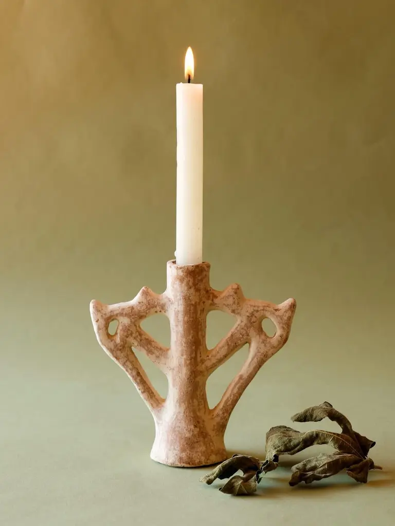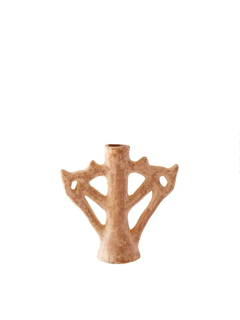 - Handbuilt freckles terracotta candle holder- made of clay collected from the potter's surroundings.- made in the Moroccan Rif mountains by HoudaApproximate measurements: 1.8 x 6.9 x 5.5 in / 4.5 x 17.5 x 14 cmHandmade : Variation is to be expected, each piece differs in color, size, shape and decorations due to its handmade nature and natural pigments. Memòri is about simplicity, imperfections, and embracing the "flaws".Each piece is fired in an open fire, which makes unexpected and surprising results, including smoke marks on some pieces. This means that each piece is one of a kind and cannot be duplicated.Care instructions: The ceramics are not glazed. We advise you to keep it as a decorative object if you want to conserve the original aspect. About the savoir-faire, the modeled potteryThe potters of northern Morocco perpetuate the ancient art of modeled pottery, which first appeared around 6,000 BC. The techniques and patterns used today are very close to those of their origins. This ancestral know-how, which has disappeared around the Mediterranean, still lives in the pre-Rif. Today, these potters are the guardians of this ancient art. The modeled pottery according to the ancestral art of primitive firing depends on the weather, the women potters make their pieces and then fire them in an open fire for more than 12 hours. Depending on the tribe, the potter prepares an open fire or a dug hole - a pit oven -, and covers it with wood and shavings. It requires a slow combustion below 1000 degrees Celsius. At each step of the process, the materials used are natural and come from the potter’s surroundings; the clay and grog dug from the earth, mineral pigments for painting. The primitive firing technique leads to unpredictable and unexpectedly beautiful results, including the appearance of fire marks on certain parts.About the artisanHouda started working as a potter in order to help her parents who just bought land. Her two sisters assist her in her job, helping her pick up clay in the mountains and cow dung to prepare the fuel for the in-ground kiln. She likes to mix tradition and modernity, combining the motives of her tribe with new shapes and designs.