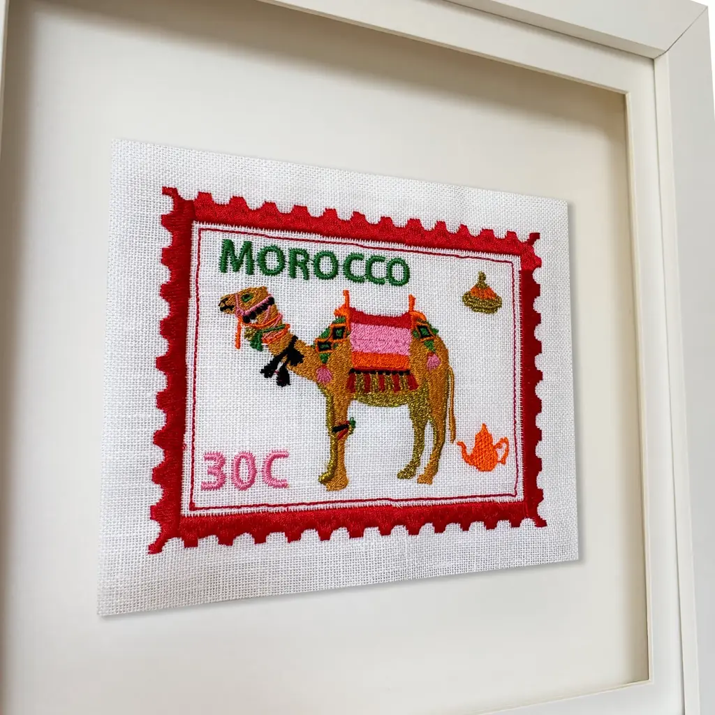 Hello, I’m Emma the owner of Lilly Loves - an embroidery studio located in London.I wanted to create a range of unique embroidered stamps from all over the world, inspired by Morocco; these are bright and fun with a playful twist. We stitch all of these in our London studio and use beautiful floating frames. 10"x10" inches 3D Deep Box Frame