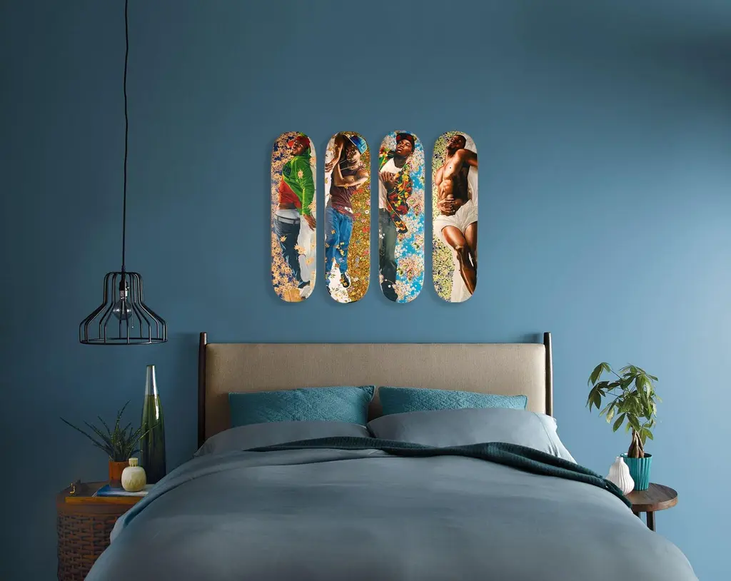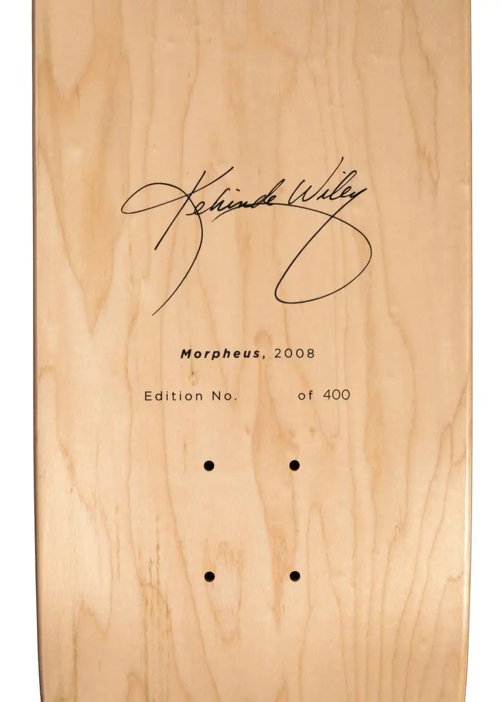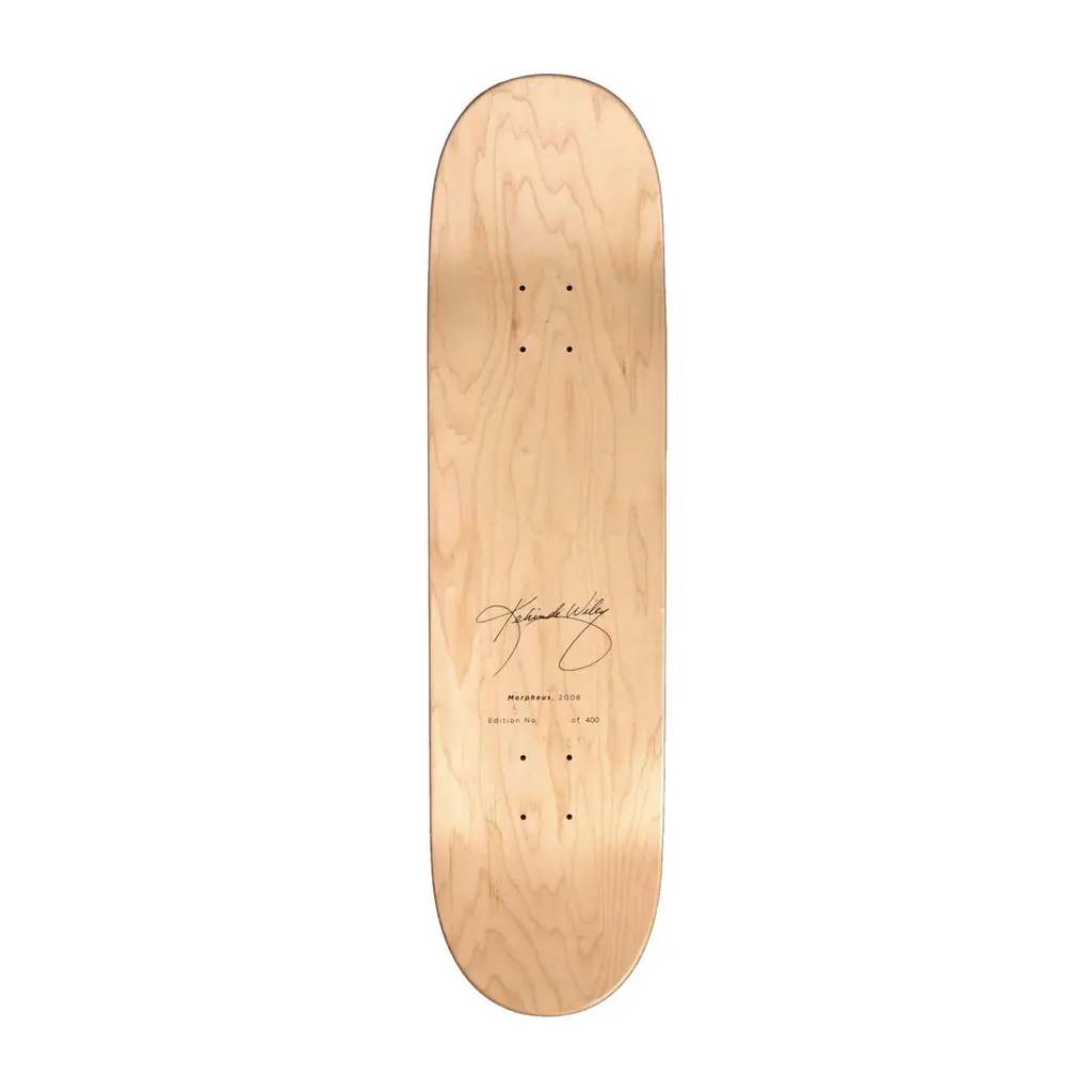 100% sustainably sourced hard rock maple8" w. x 31.875" l.edition of 400hand-numbered with screen-printed signaturepackaged in cotton dust baghanging hardware not includedThis limited edition skate deck features Kehinde Wiley's 2008 painting Morpheus, reimagined from the Jean-Antoine Houdon 1777 marble sculpture of the same name. Feautred in the 2008 exhibition DOWN at Deitch Projects, the series references and re-conceptualizes classic pictorial forms of heroism in the face of death. Morpheus features a model from Brooklyn, lain across a while sheet while florals from the background spring into life around his body. Unlike its 18th century counterpart, he addresses onlookers with direct eye contact and a seductive look of invitation, with the repeating floral background protruding into the foreground.A portion of the proceeds from your purchase support the artists-in-residence program Black Rock Sénégal, founded by Wiley in 2019.