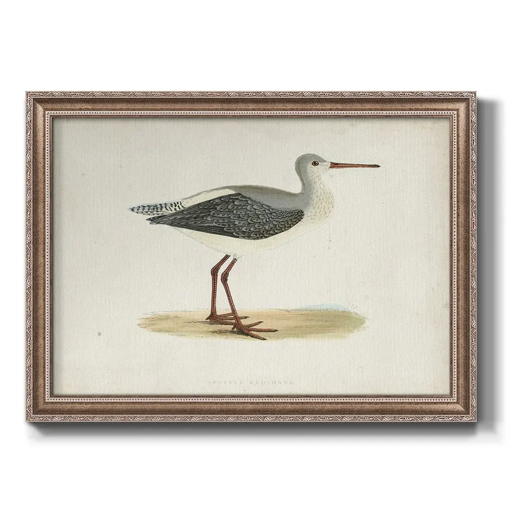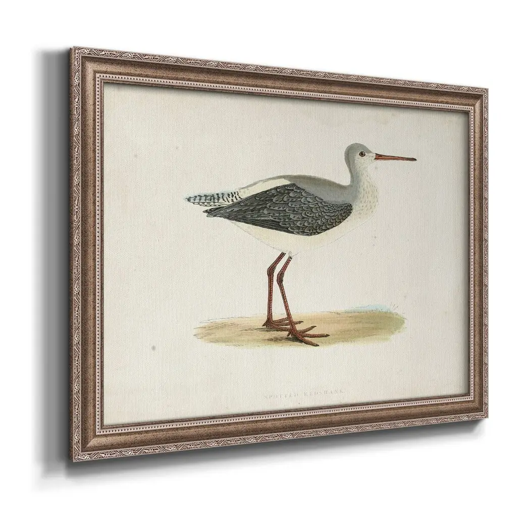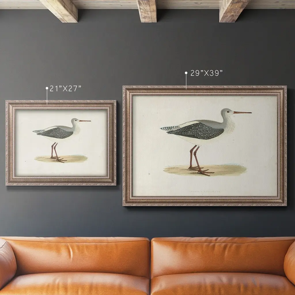 Morris Sandpipers I Premium Framed Canvas- Ready to Hang A Premium Framed Canvas created to last. Framed in distressed wood and available in an array of sizes and colors Featuring a beveled a solid wood stretcher bar, each piece comes ready to hand 3 SIZES AVAILABLE 16''X20'' - Overall Size 18'X27'' - Overall Size 24''x36'' - Overall Size Each piece is made to order. Each piece comes with hanging hardware. Made in the USA Ready to Hang Giclee Paper Print Acrylic Glass Beveled Matt Board
