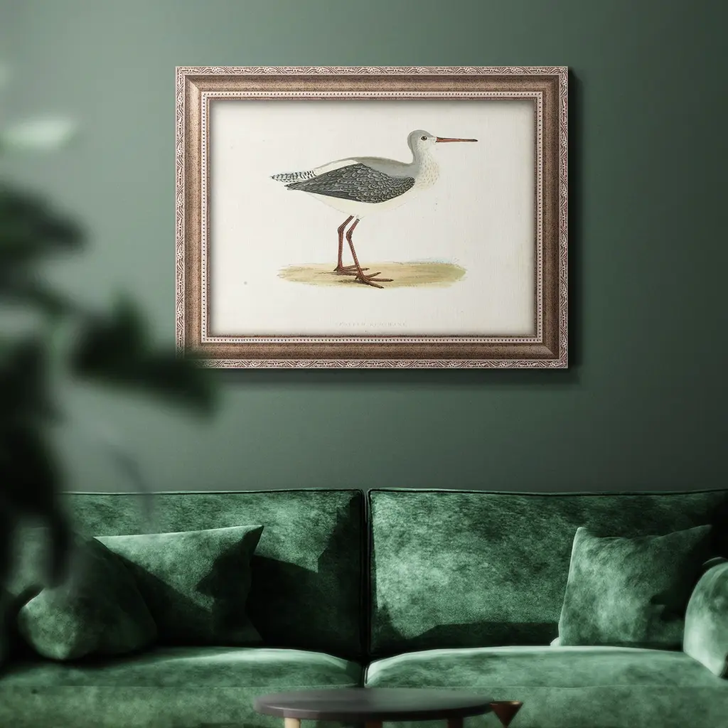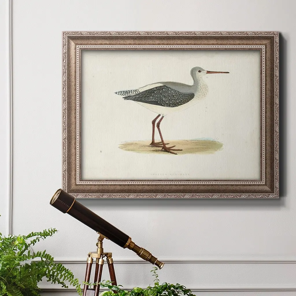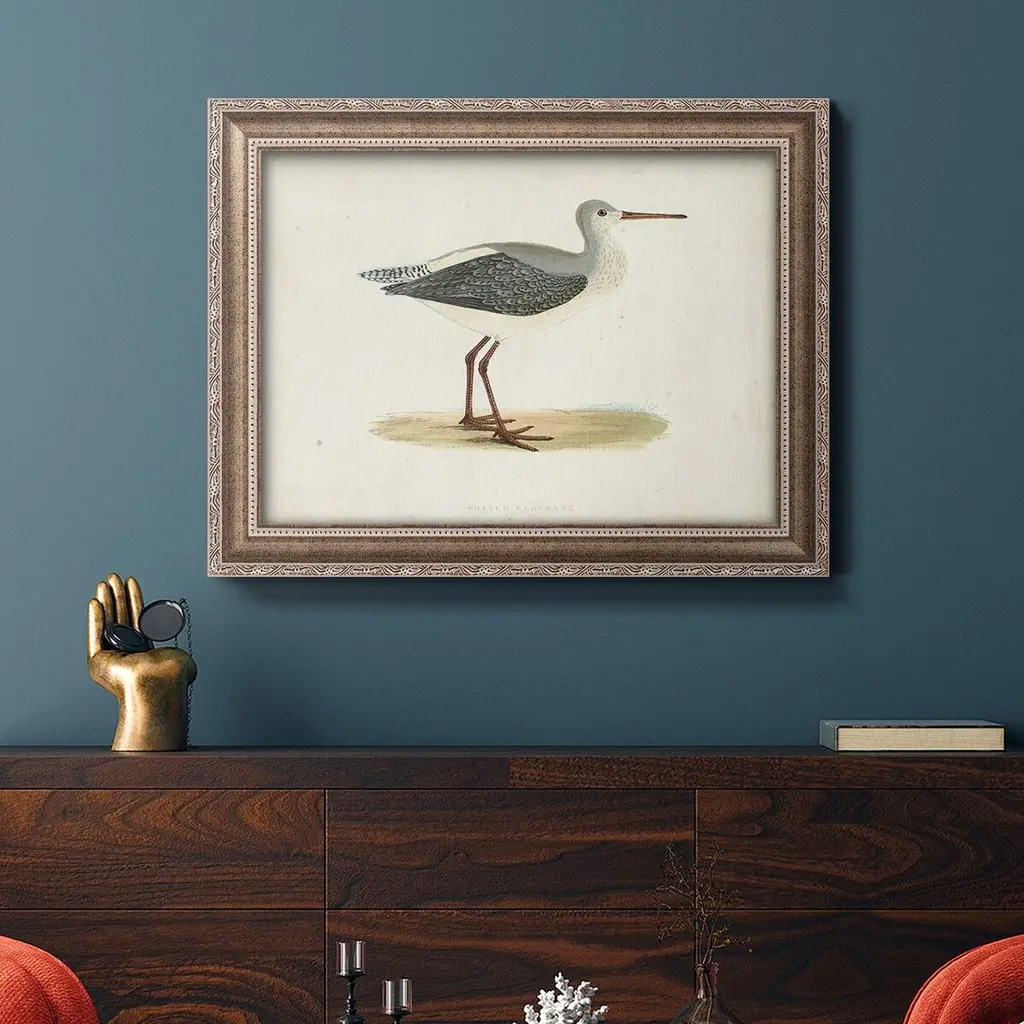 Morris Sandpipers I Premium Framed Canvas- Ready to Hang A Premium Framed Canvas created to last. Framed in distressed wood and available in an array of sizes and colors Featuring a beveled a solid wood stretcher bar, each piece comes ready to hand 3 SIZES AVAILABLE 16''X20'' - Overall Size 18'X27'' - Overall Size 24''x36'' - Overall Size Each piece is made to order. Each piece comes with hanging hardware. Made in the USA Ready to Hang Giclee Paper Print Acrylic Glass Beveled Matt Board