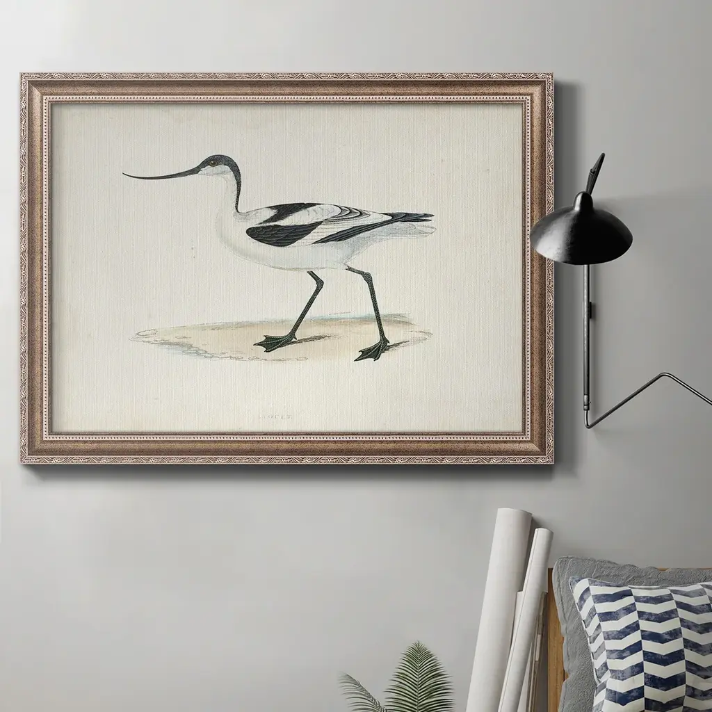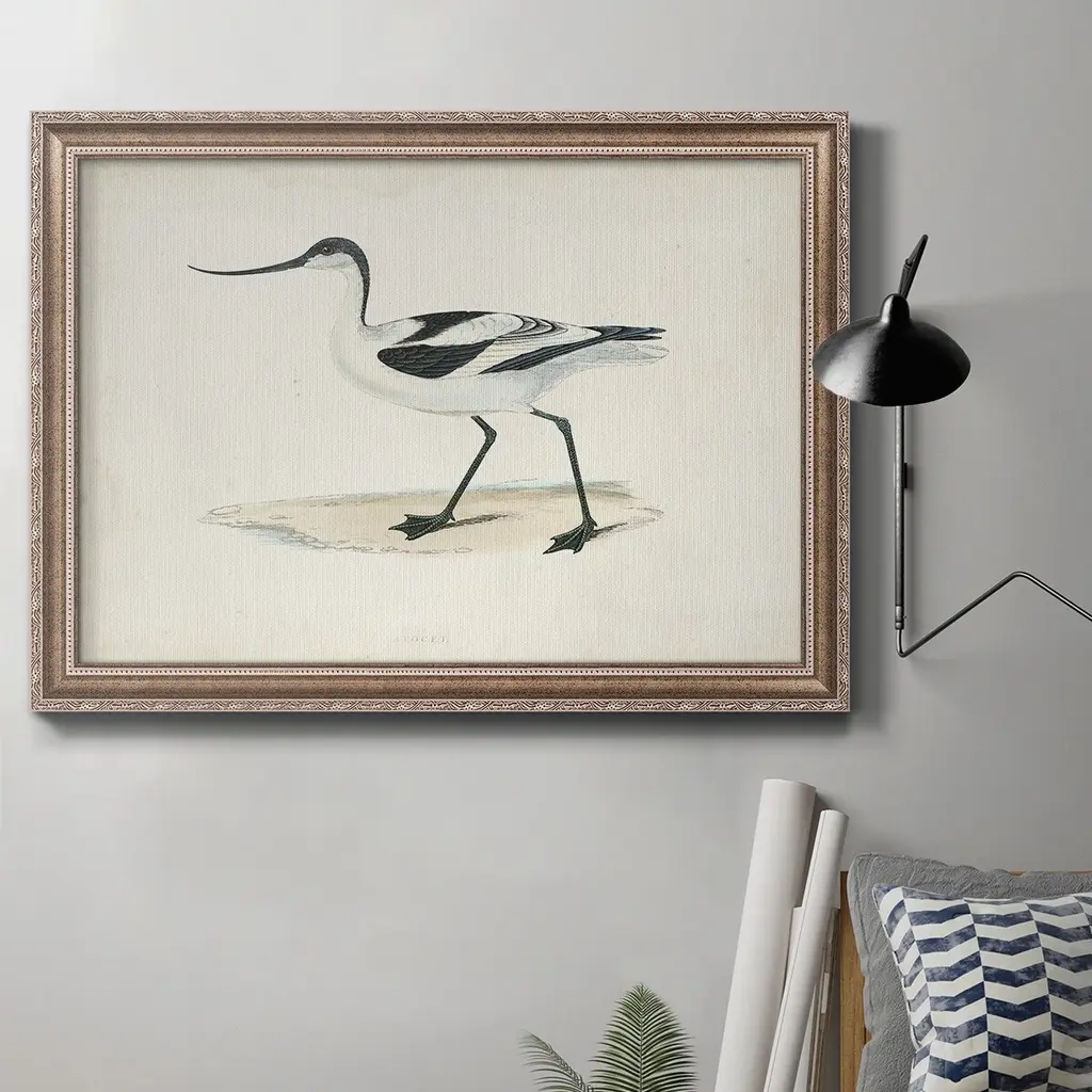 Morris Sandpipers IV Premium Framed Canvas- Ready to Hang A Premium Framed Canvas created to last. Framed in distressed wood and available in an array of sizes and colors Featuring a beveled a solid wood stretcher bar, each piece comes ready to hand 3 SIZES AVAILABLE 16''X20'' - Overall Size 18'X27'' - Overall Size 24''x36'' - Overall Size Each piece is made to order. Each piece comes with hanging hardware. Made in the USA Ready to Hang Giclee Paper Print Acrylic Glass Beveled Matt Board