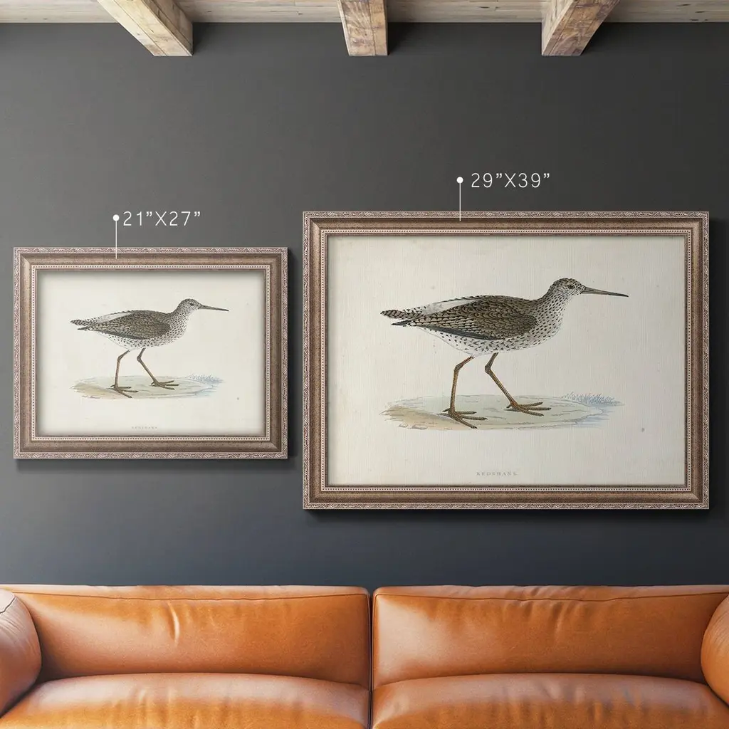 Morris Sandpipers V Premium Framed Canvas- Ready to Hang A Premium Framed Canvas created to last. Framed in distressed wood and available in an array of sizes and colors Featuring a beveled a solid wood stretcher bar, each piece comes ready to hand 3 SIZES AVAILABLE 16''X20'' - Overall Size 18'X27'' - Overall Size 24''x36'' - Overall Size Each piece is made to order. Each piece comes with hanging hardware. Made in the USA Ready to Hang Giclee Paper Print Acrylic Glass Beveled Matt Board