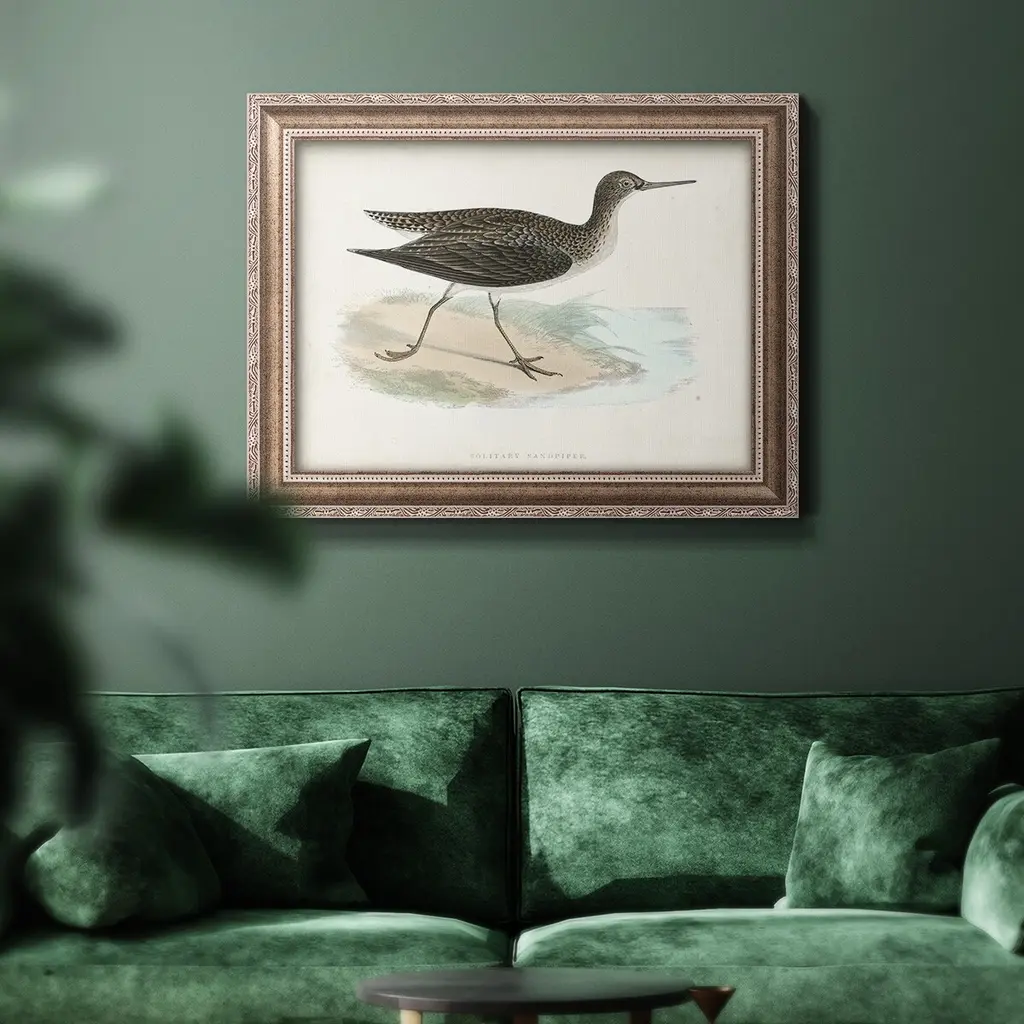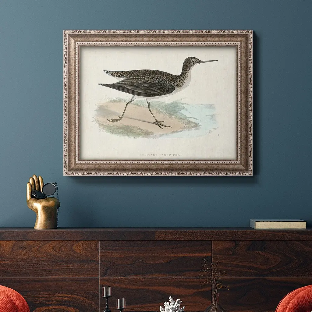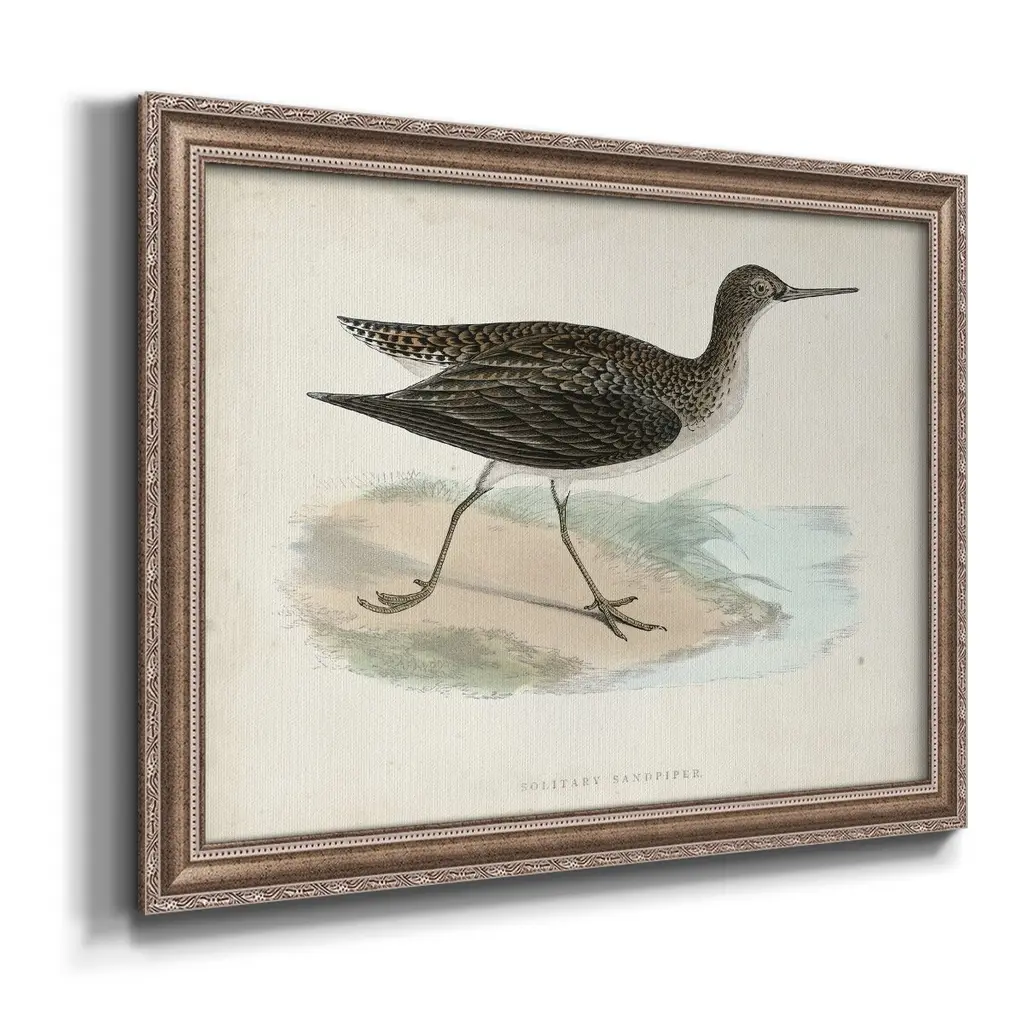 Morris Sandpipers VII Premium Framed Canvas- Ready to Hang A Premium Framed Canvas created to last. Framed in distressed wood and available in an array of sizes and colors Featuring a beveled a solid wood stretcher bar, each piece comes ready to hand 3 SIZES AVAILABLE 16''X20'' - Overall Size 18'X27'' - Overall Size 24''x36'' - Overall Size Each piece is made to order. Each piece comes with hanging hardware. Made in the USA Ready to Hang Giclee Paper Print Acrylic Glass Beveled Matt Board
