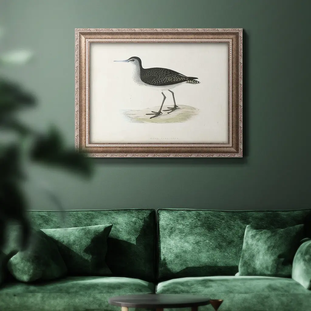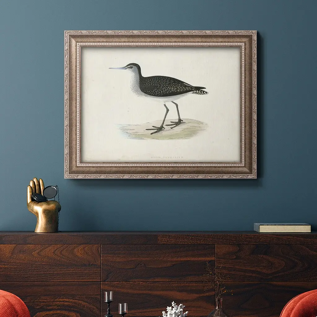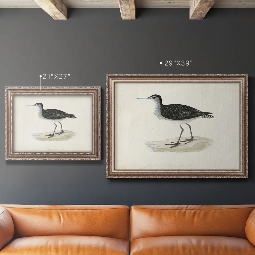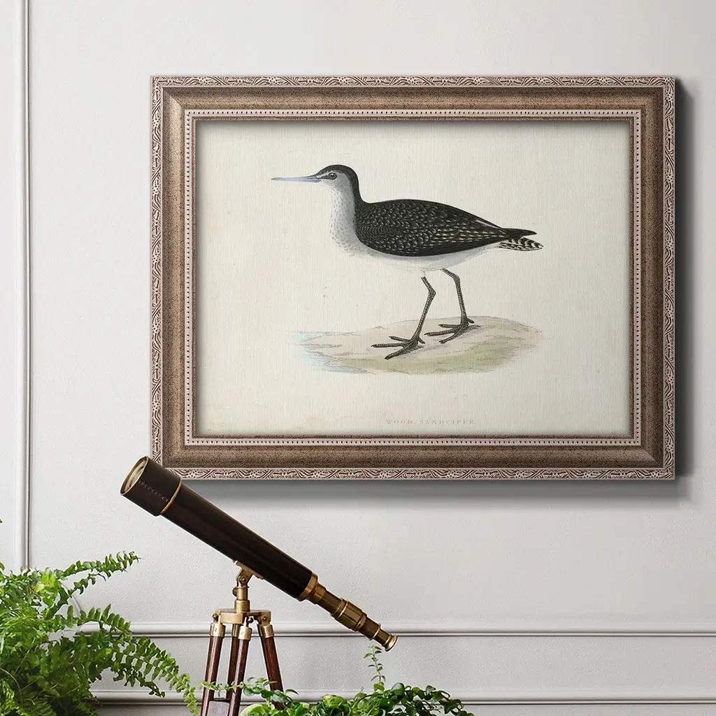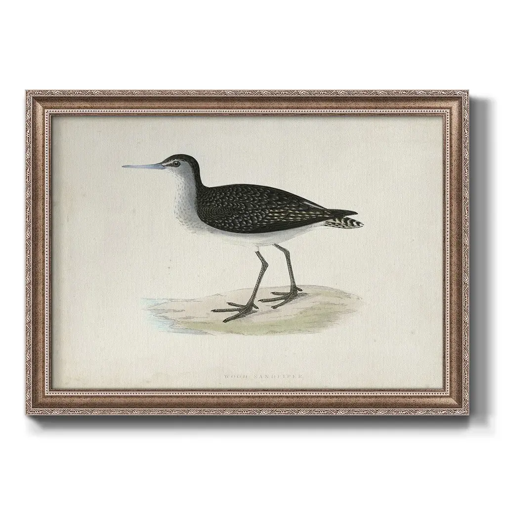 Morris Sandpipers VIII Premium Framed Canvas- Ready to Hang A Premium Framed Canvas created to last. Framed in distressed wood and available in an array of sizes and colors Featuring a beveled a solid wood stretcher bar, each piece comes ready to hand 3 SIZES AVAILABLE 16''X20'' - Overall Size 18'X27'' - Overall Size 24''x36'' - Overall Size Each piece is made to order. Each piece comes with hanging hardware. Made in the USA Ready to Hang Giclee Paper Print Acrylic Glass Beveled Matt Board