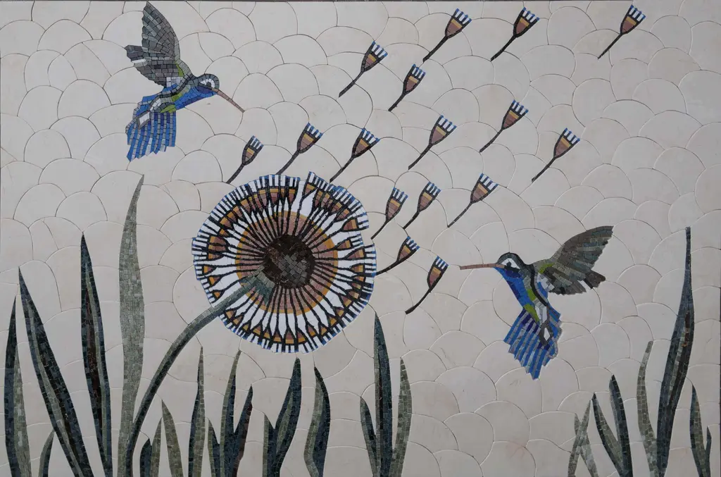 A stunning hummingbird is portrayed in this mosaic art by using colorful shades of blue green and black. Perfect addition to any animal and nature lover this artwork is sure to a unique touch to any of your indoor or outdoor rooms.