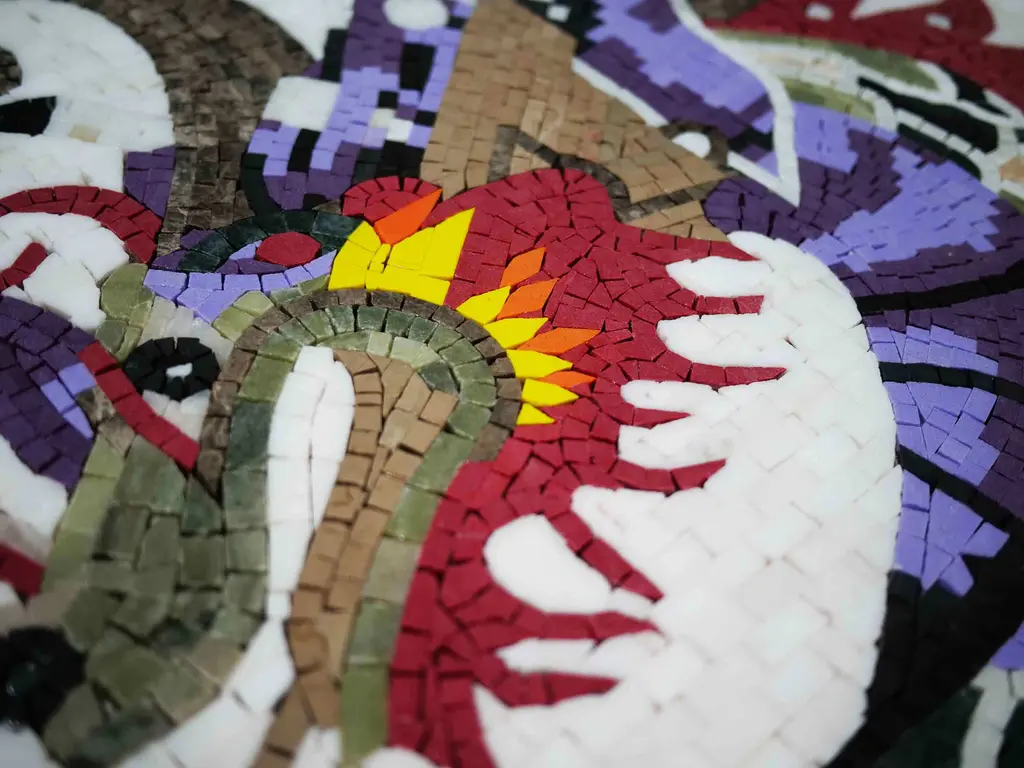 Transform your living space into a realm of enchantment with our stunning Mosaic Artwork - The Colorful Dragon. This exquisite piece features a breathtaking representation of a vibrant dragon, intricately crafted against a crisp white backdrop that highlights its rich hues and dynamic energy. Each mosaic tile is carefully selected and placed by skilled artisans, ensuring every detail is brought to life with precision and care. This artwork is not just a decoration; it is a statement piece that embodies artistry and craftsmanship. The classic design harmonizes effortlessly with any home décor style, from modern to traditional, making it a versatile addition that enhances the charm and sophistication of your space. Whether displayed in your living room, hallway, or office, it is sure to become a captivating conversation starter, enchanting all who behold it. The Colorful Dragon celebrates creativity and imagination, perfect for those who appreciate unique art forms. Its vibrant colors and intricate patterns give it undeniable presence, adding energy and flair to your interior. This mosaic showcases premium quality natural stones, including luminous Prisma Yellow Quartz and radiant Orange Quartz that shimmer with crystalline brilliance. The jewel-like Light Red Quartz and the prismatic Light and Dark Purple Quartz add scintillating depth and translucent richness, elevating the piece's exotic allure. These luxury stone colors create a dazzling palette that is silky and cool to the touch, reflecting the refined taste of discerning collectors. More than just art, it is an expression of individuality and style, promising to foster an atmosphere of distinction and prestige in your home. As you proudly display this magnificent handcrafted mosaic, you will cultivate lasting memories and inspire awe in your guests. The artwork becomes a focal point that connects your interior spaces, enlivens your walls, and reflects your personality. Experience the perfect balance of timeless sophistication and captivating aesthetic value with this remarkable piece. Elevate your home décor today with our Mosaic Artwork - The Colorful Dragon and immerse yourself in a world of beauty and creativity.