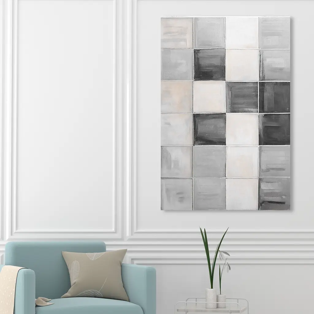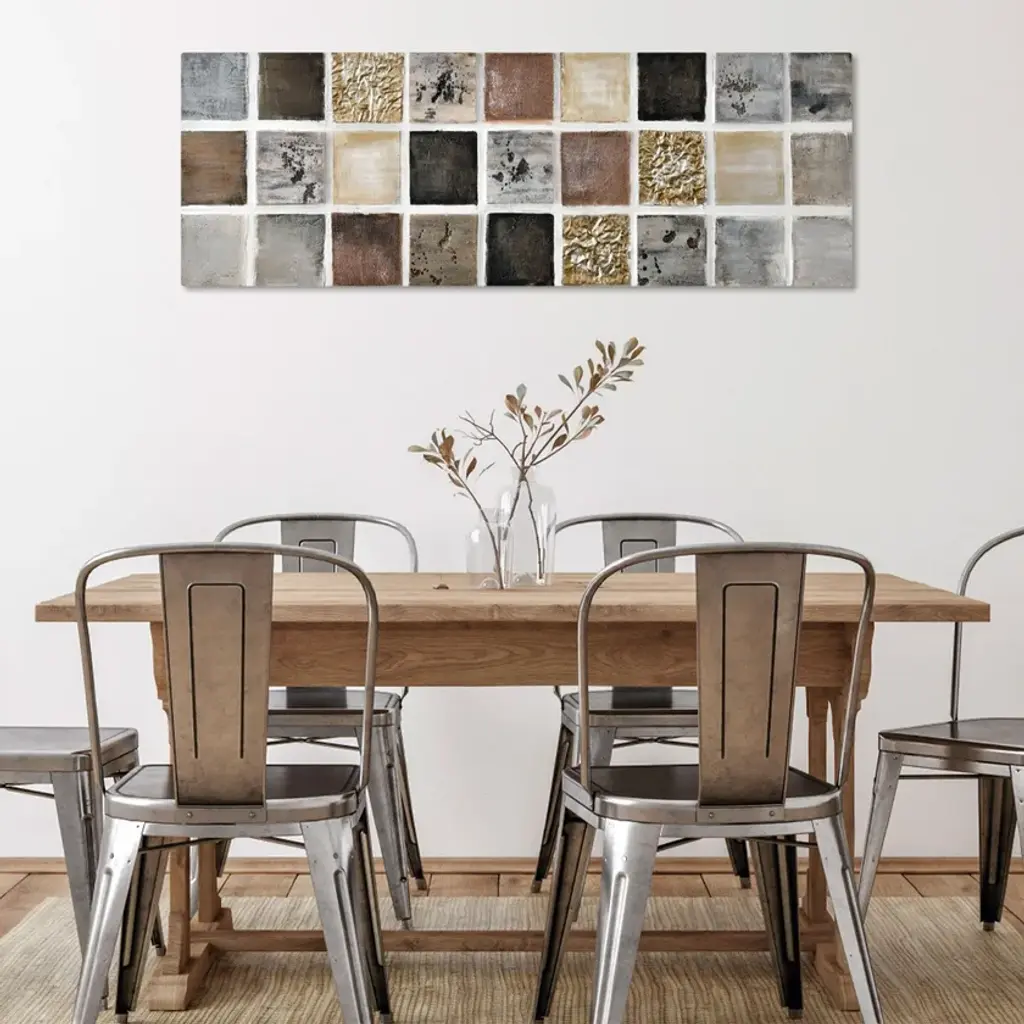 Mosaic is a hand-painted abstract painting on canvas. Divided into square sections featuring textural patterns, the work is an interesting application of minimalist design. With a wooden inner frame and painted edges, the painting is ready to hang.The AGAVE Quadri collection represents the excellence of contemporary art applied to the world of interior design. Each piece, hand-painted with artisanal techniques by the finest artists in collaboration with the Italian company AGAVE, combines abstract, natural, and figurative elements to create unique and refined works. These paintings transform spaces into environments of great elegance and character, perfect for interior design projects that require a distinctive and artistic touch.