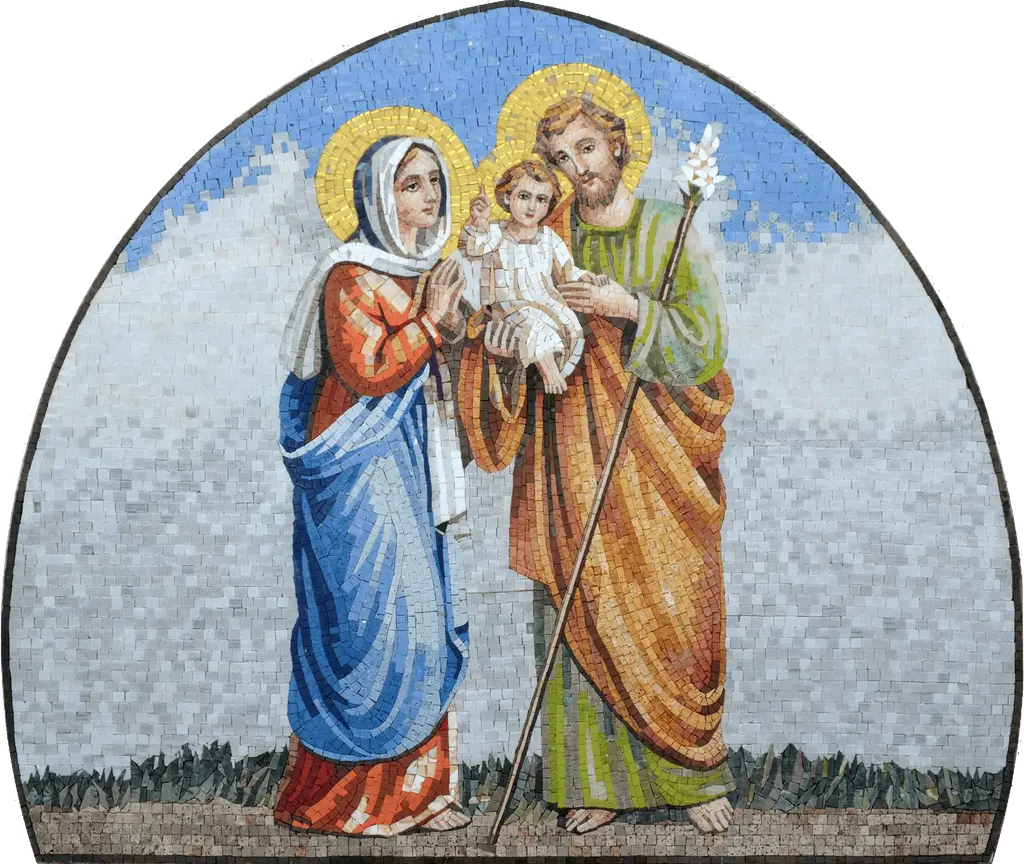 Introducing our exquisite "Mosaic Design - Jesus With Mary & Joseph," a breathtaking piece of art that beautifully captures a tender moment in history. This stunning mosaic artwork portrays the infant Jesus nestled in the loving embrace of his parents, the Virgin Mary and Joseph. Each detail has been meticulously handcrafted, ensuring that every piece of marble and glass reflects the care and dedication that went into its creation.Crafted from high-quality marble stones, this mosaic is not only a true representation of religious devotion but also a remarkable work of art that fits seamlessly into any decor. The golden glass that adorns their halos adds a touch of elegance and brilliance, allowing the artwork to radiate light and warmth wherever it is displayed. Whether you choose to adorn your living room, entryway, or even an outdoor space, this versatile piece complements both classic and contemporary settings alike.The "Mosaic Design - Jesus With Mary & Joseph" serves not only as a striking focal point in your home but also as a source of inspiration and reflection. It's a perfect gift for housewarmings, religious celebrations, or for anyone who cherishes their faith and appreciates the beauty of handcrafted art. Easy to install, this exquisite mosaic wall art can be hung as a centerpiece in a gallery wall or placed quietly in a cozy nook to bring peace and serenity to your space. Its durable construction ensures that it will adorn your walls for years to come, making it a timeless addition to your collection.Bring home the spirit of faith and family with this remarkable piece. Order your "Mosaic Design - Jesus With Mary & Joseph" today and experience the harmony it brings into your life and home.