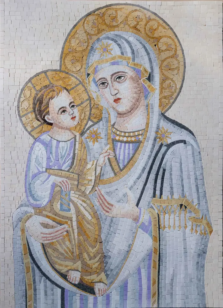 Introducing the Mosaic Icon - Majestic Virgin Mary and Jesus, a stunning piece of art that brings timeless beauty and spiritual elegance to your home or workspace. This exquisite icon showcases a meticulously handcrafted design, featuring an intricate portrait of the Virgin Mary holding the infant Jesus, created with hand-cut tiles that highlight the craftsmanship and attention to detail that goes into every piece.Each tile is lovingly placed by skilled artisans, ensuring that no two icons are exactly alike, making this a unique addition to your collection. The vibrant colors and rich textures of the mosaic come together to create a striking visual representation of one of the most revered figures in religious art. This piece not only serves as a beautiful decoration but also as a source of inspiration and contemplation for those who admire it.Crafted as a museum-quality reproduction of a classic masterpiece, the Mosaic Icon - Majestic Virgin Mary and Jesus is perfect for any decor style—whether you're looking to enhance a traditional setting or add a touch of elegance to a modern space. Its durable design ensures that it will remain a cherished part of your decor for years to come, making it an ideal gift for loved ones or for your own spiritual journey.This mosaic icon is a blessing addition, deeply resonating with faith and devotion, allowing you to invite a sense of peace and tranquility into any environment. Elevate your home decor and celebrate your spirituality with this captivating representation of the Virgin Mary and Jesus—an artwork that inspires admiration and reverence while seamlessly blending into your everyday life. Make it a centerpiece in your living room, a serene addition in your bedroom, or a focal point in your prayer space. Indulge in the beauty of this handcrafted masterpiece and bring the divine grace of the Virgin Mary and Jesus into your home today. Experience the enchanting power of art fused with faith and let the Mosaic Icon serve as a daily reminder of love, compassion, and hope.