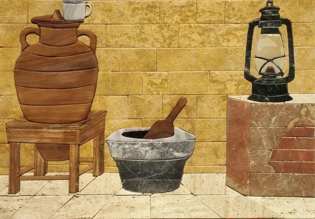 If you are looking for durable and stunning mosaic patterns consider the mosaic Prehistoric Vermiglio. This stone art piece features a lantern jug and other kitchen equipment. The colors are neutral and beautifully blended making it look like still life classic paintings. If you want something rustic for your country home this mosaic picture is perfect. Choose it in a natural tumbled or polished finish and get a frame on it if you wish.