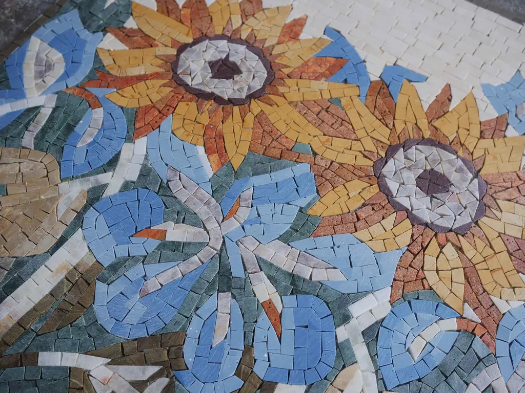 Introducing "Mosaic Sunflowers - Fleurs de la Soleil," a breathtaking piece of art that brings the vibrant essence of nature into your home. This exquisite mosaic showcases an enchanting array of fiery sunflowers in brilliant shades of orange, yellow, and blue, capturing the essence of a sun-drenched garden in full bloom. Each sunflower is meticulously crafted using handcut marble, ensuring that every piece is unique and a true work of art.Perfect for infusing warmth and character into any space, the "Mosaic Sunflowers" serves as an eye-catching focal point in your bedroom, living room, or even outdoor areas like your backyard. Imagine the joy of having this radiant piece adorning your walls, exuding positivity and warmth that uplifts your mood and brightens your day. Its versatility doesn't stop there; this stunning mosaic can also transform more functional spaces such as kitchens and bathrooms. Use it as a vibrant backsplash to create a fresh and inviting atmosphere, turning everyday moments into extraordinary experiences. Crafted with high-quality materials, this mosaic is not only a visual delight but also a durable addition to your home decor. It complements various design styles, from modern to traditional, making it an ideal choice for anyone looking to enhance their interior aesthetic.Whether you're looking to create a cheerful ambiance in your living space or searching for the perfect gift for a loved one who appreciates art and beauty, "Mosaic Sunflowers - Fleurs de la Soleil" is a timeless choice that will be cherished for years to come. Elevate your home with this stunning artwork and let the beauty of sunflowers bring joy and warmth into your everyday life.