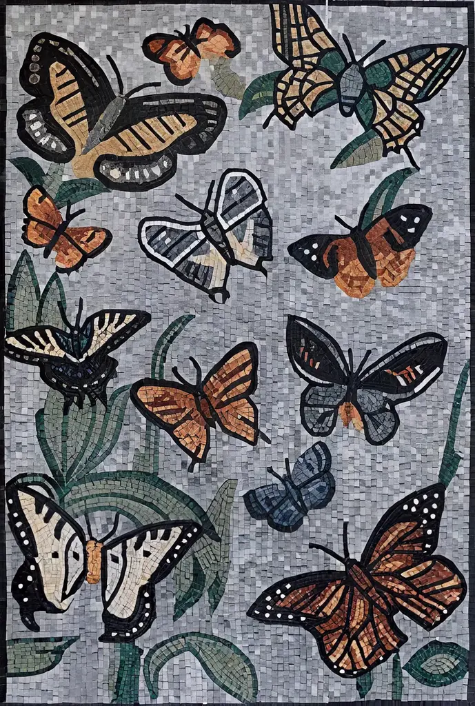 Introducing our exquisite Mosaic Tile Art - Butterfly Charms, a stunning addition to any space that celebrates the beauty of nature and artistry. This intricate mosaic features vibrant and colorful butterfly designs that are skillfully crafted to create a striking piece of art. Each butterfly charm is meticulously arranged to form a breathtaking visual display, capturing the essence of these delicate creatures in a way that adds depth and richness to your decor. Transform your walls or floor with this captivating mosaic art piece, perfect for enhancing the aesthetics of your living room, entryway, or any area where you wish to make a statement. Whether you choose to display it as a focal point or incorporate it into a larger design, the Butterfly Charms mosaic can elevate your home decor with its enchanting imagery.We understand that every home is unique, which is why we offer customization options to suit your specific needs. You can choose from a variety of sizes and border styles, ensuring that your mosaic tile art fits perfectly within your space and complements your existing decor. With limitless options available, you can create a personalized masterpiece that reflects your individual taste and style.Bring the beauty of nature indoors and make a vibrant addition to your home with our Mosaic Tile Art - Butterfly Charms. It's not just a decorative piece; it's a celebration of art and nature that will inspire joy and admiration in everyone who sees it. Order yours today and let the charm of butterflies add a splash of color and elegance to your surroundings.